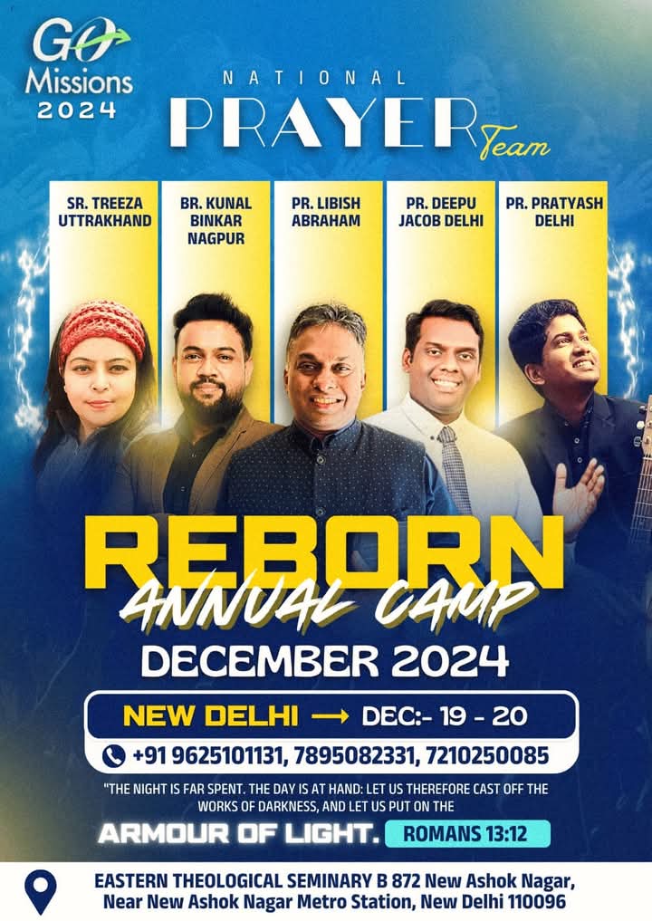 ന്യൂഡൽഹി : നാഷണൽ പ്രയർ ടീമിന്റെ ആഭിമുഖ്യത്തിൽ ഡിസംബർ 19 നും 20 നുമായി ന്യൂ അശോക് നഗർ ഈസ്റ്റേൺ തിയോളജിക്കൽ സെമിനാരിയിൽ റീബോൺ ആനുവൽ ക്യാമ്പ് നടക്കും. സിസ്റ്റർ ട്രീസ, ബ്രദർ കുനൽ പിൻകാർ, പാ. ലിബീഷ് എബ്രഹാം, പാ. ദീപു ജേക്കബ്, പാ. പ്രത്യാഷ് എന്നിവർ ക്യാമ്പ് നയിക്കും.