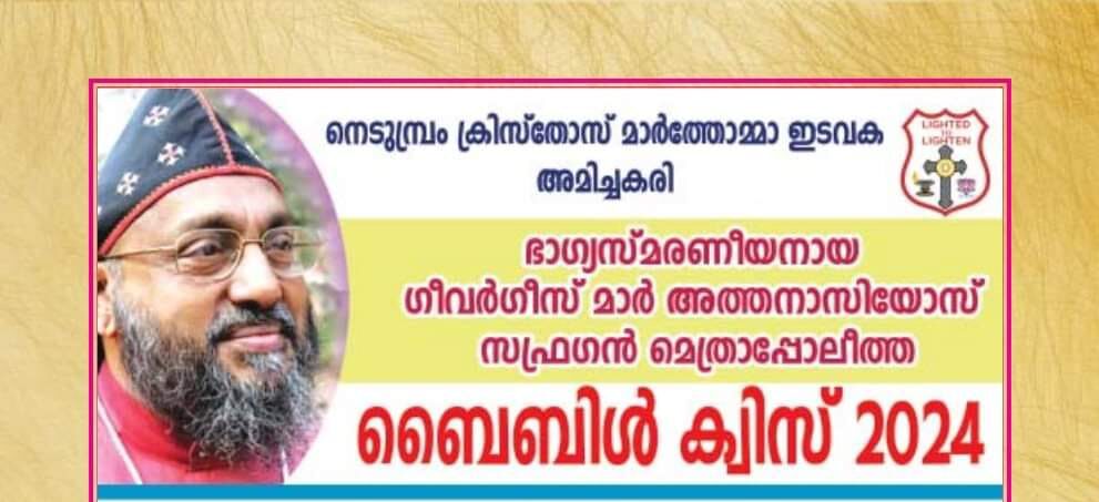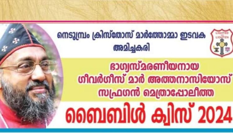 നെടുമ്പ്രം : നെടുമ്പ്രം ക്രിസ്തോസ് മാർത്തോമ്മാ ഇടവകയുടെ ആഭിമുഖ്യത്തിൽ നവംബർ 9 ന് നെടുമ്പ്രം ക്രിസ്തോസ് മാർത്തോമ്മാ ഇടവകയിൽ ബൈബിൾ ക്വിസ് നടക്കും.
