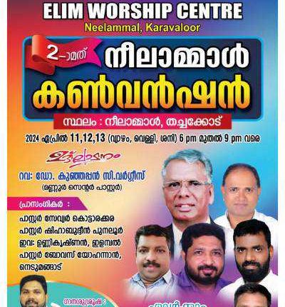 പുനലൂർ : ഇന്ത്യ പെന്തകോസ്ത് ദൈവസഭ കരവാളൂർ , നീലാമ്മൽ എലിം വർഷിപ്പ് സെന്ററിന്റെ നേതൃത്വത്തിൽ നീലാമ്മാൽ കൺവെൻഷൻ ഏപ്രിൽ 11 മുതൽ 13 വരെ നടത്തപ്പെടുന്നു. പാ. ഷിബു അഞ്ചലിന്റെ നേതൃത്വത്തിൽ മണ്ണൂർ സെന്റർ പ്രസിഡണ്ട് ഡോ. കുഞ്ഞപ്പൻ സി. വർഗീസ് ഉദ്ഘാടനം നിർവഹിക്കുകയും പാസ്റ്റർമാരായ സേവ്യർ കൊട്ടാരക്കര , ശിഹാബുദ്ധീൻ പുനലൂർ , ഉണ്ണികൃഷ്ണൻ ഇളമ്പൽ , ബോവസ് നെടുമങ്ങാട് എന്നിവർ വചനത്തിൽ നിന്ന് സംസാരിക്കും. പാ. പ്രിനു അരുമാനൂർ സംഗീത ശുശ്രുഷ നിർവഹിക്കും.