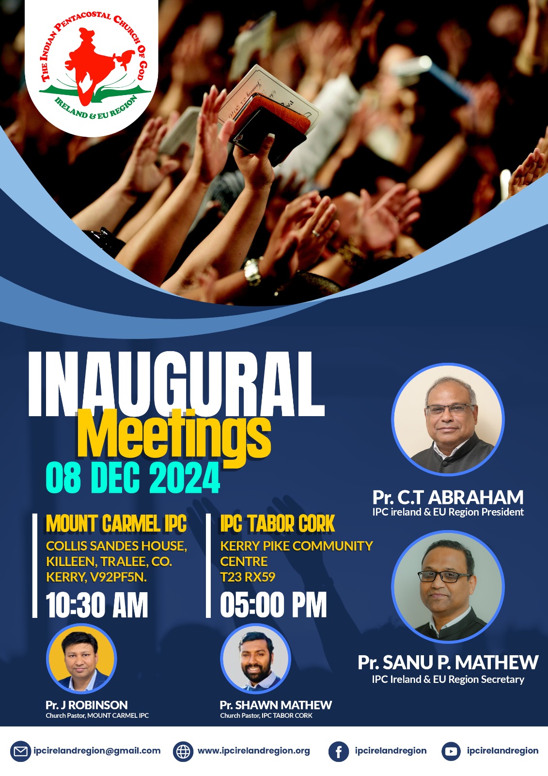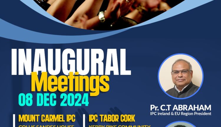 ഡിസംബർ എട്ട് രാവിലെ പത്തരക്ക് കെറിയിലെ കൂട്ടായ്മ ട്രാലീയിലുള്ള കോളിസ് സാൻഡസ് ഹൗസിലും വൈകിട്ട് അഞ്ചിന് കോർക്കിലുള്ള കൂട്ടായ്മ കെറി പൈക്ക് കമ്മ്യൂണിറ്റി സെന്ററിലും ഐ പി സി അയർലൻഡ് & ഇ.യു റീജിയൻ പ്രസിഡന്റ് പാസ്റ്റർ സി റ്റി എബ്രഹാം ഉദ്ഘാടനം ചെയ്യും.