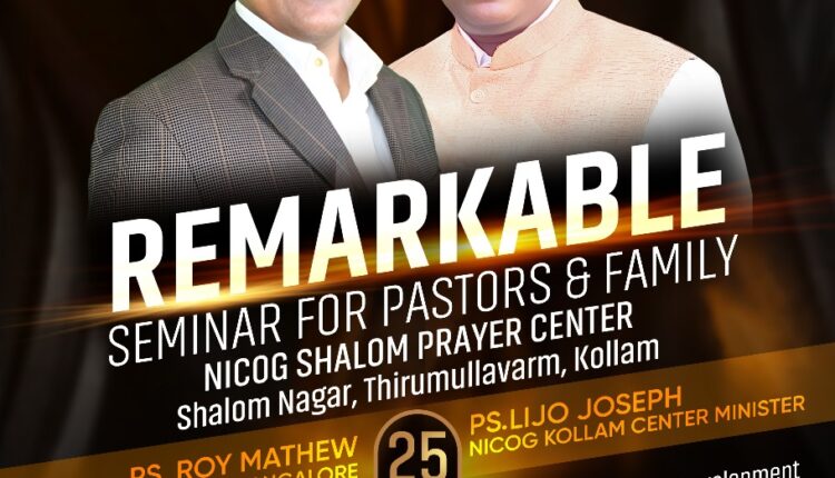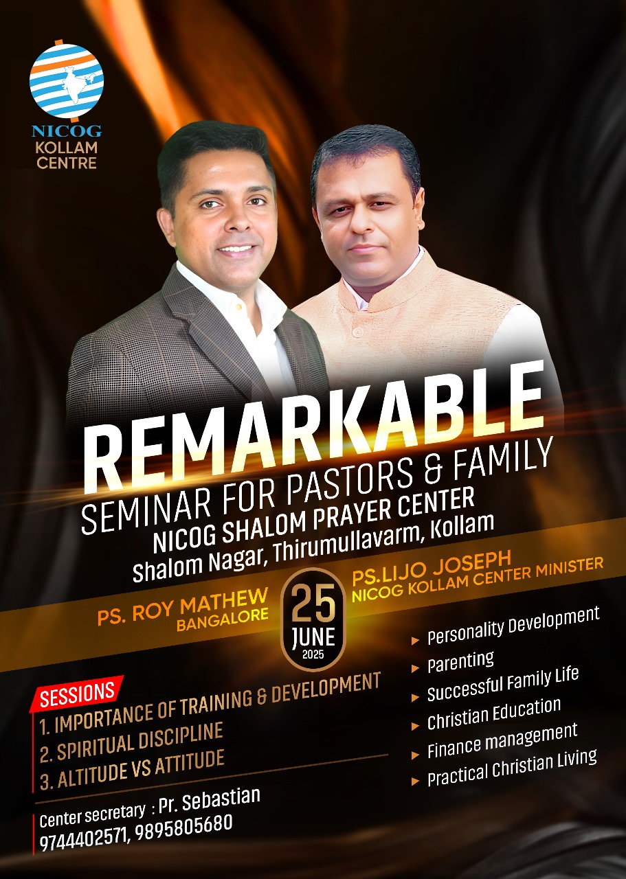 കൊല്ലം : ന്യൂ ഇന്ത്യ ചർച്ച് ഓഫ് ഗോഡ് കൊല്ലം സെന്ററിന്റെ ആഭിമുഖ്യത്തിൽ ജൂൺ 25 ന് രാവിലെ 10 മണിക്ക് ന്യൂ ഇന്ത്യ ചർച്ച് ഓഫ് ഗോഡ് ശാലോം പ്രയർ സെന്ററിൽ പാസ്റ്റേഴ്സ് ആൻഡ് ഫാമിലി സെമിനാർ നടക്കും.