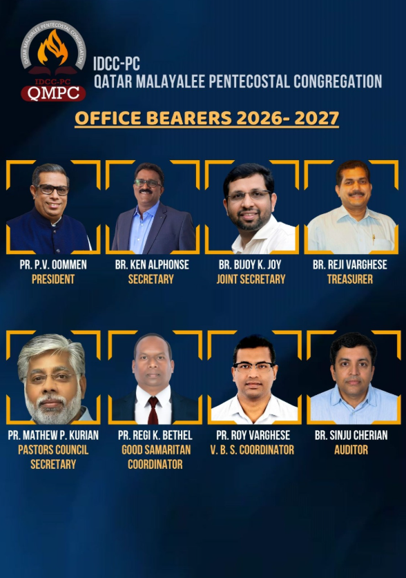 ഖത്തർ : ഖത്തറിലെ പെന്തക്കോസ്തു സഭകളുടെ ഐക്യവേദിയായ ഖത്തർ മലയാളി പെന്തക്കോസ്തൽ കോൺഗ്രിഗേഷൻ 2026-27 പ്രവർത്തന വർഷത്തേക്കുള്ള പുതിയ നേതൃത്വത്തെ തിരഞ്ഞെടുത്തു. ദോഹയിൽ ചേർന്ന വാർഷിക ജനറൽ ബോഡി യോഗത്തിൽ പാസ്റ്റർ സാം റ്റി. ജോർജ് അധ്യക്ഷത വഹിച്ചു. പാസ്റ്റർ പി.വി. ഉമ്മൻ (പ്രസിഡൻറ്), കെൻ അൽഫോൺസ് (സെക്രട്ടറി), ബിജോയ് കെ. ജോയി (ജോയിൻ്റ് സെക്രട്ടറി), റെജി വർഗീസ് (ട്രഷറർ) എന്നിവർ പുതിയ ഭാരവാഹികളായി ചുമതലയേറ്റു. പാസ്റ്റർ മാത്യു പി. കുര്യൻ (പാസ്റ്റേഴ്സ് കൗൺസിൽ സെക്രട്ടറി), പാസ്റ്റർ റെജി കെ. ബഥേൽ (ഗുഡ് സമരിറ്റൺ കോർഡിനേറ്റർ), പാസ്റ്റർ റോയി വർഗീസ് (വി.ബി.എസ് കോഡിനേറ്റർ), സിഞ്ചു ചെറിയാൻ (ഓഡിറ്റർ) എന്നിവരെയും തിരഞ്ഞെടുത്തു. പാസ്റ്റർ പി.എം ജോർജ് പുതിയ ഭാരവാഹികൾക്കായി പ്രാർത്ഥന നിർവഹിച്ചു. പുതിയ നേതൃത്വത്തിന് കീഴിൽ സഭയുടെ സേവന പ്രവർത്തനങ്ങളിൽ വലിയ മാറ്വും പുരോഗതിയും ഉണ്ടാകുമെന്ന പ്രതീക്ഷയിലാണ് പ്രവാസികളായ വിശ്വാസികൾ.