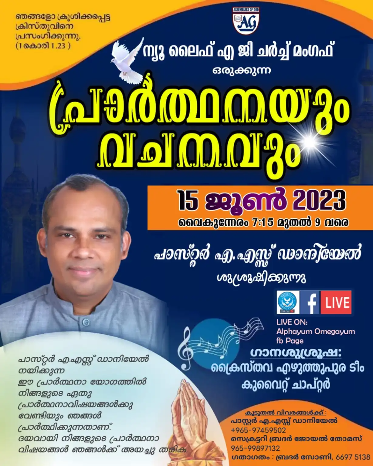 ന്യൂ ലൈഫ് എ. ജി. മംഗഫ്, കുവൈറ്റ് സഭയുടെ ആഭിമുഖ്യത്തിൽ പ്രാർത്ഥനാ യോഗം News Last updated Jun 13, 2023 182 കുവൈറ്റ് : ന്യൂ ലൈഫ് എ. ജി. മംഗഫ്, കുവൈറ്റ് സഭയുടെ ആഭിമുഖ്യത്തിൽ ജൂൺ 15 ന് പ്രാർത്ഥനാ യോഗം നടക്കും. പാസ്റ്റർ എ. എസ്. ദാനിയേൽ വചനശുശ്രുഷ നിർവഹിക്കും. കൂടുതൽ വിവരങ്ങൾക്ക് : +965 9745 9502, +965 9989 7132. 182 Share
