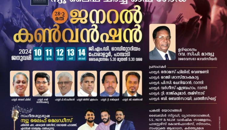 പാമ്പാടി: ന്യൂ ലൈഫ് ചർച്ച് ഓഫ് ഗോഡ് ദൈവസഭയുടെ 28 മത് ജനറൽ കൺവൻഷൻ 2024 ജനുവരി 10 മുതൽ 14 വരെ പാമ്പാടി ജി എം ഡി ഓഡിറ്റോറിയത്തിൽ വെച്ച് നടത്തപ്പെടുന്നു. ദൈവസഭ ഓവർസീർ റവ സി പി മാത്യു ഉദ്ഘാടനം ചെയുകയും പാസ്റ്റർമാരായ തോമസ് ഫിലിപ്പ്, റെജി ശാസ്താംകോട്ട, പി സി ചെറിയൻ, വർഗീസ് ഏബ്രഹാം, ടി രാജ്‌കുമാർ, ബി ബെൽസായി എന്നിവർ ദൈവവചനം ശുശ്രുഷിക്കും.