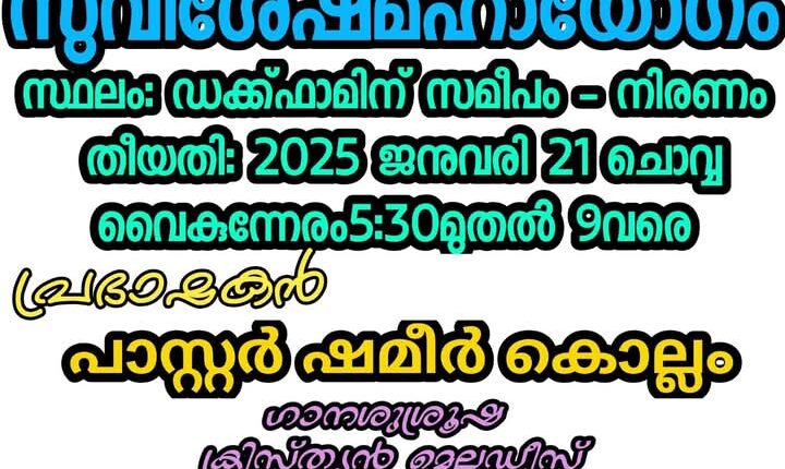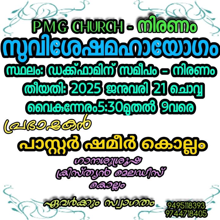നിരണം പി.എം.ജി ചർച്ച് സുവിശേഷമഹായോഗം ChristianNews On Jan 9, 2025 205 നിരണം : നിരണം പി എം ജി ചർച്ചിന്റെ ആഭിമുഖ്യത്തിൽ ജനുവരി 21 ചൊവ്വാഴ്ച നിരണം ഡക്ക്ഫാമിന് സമീപം സുവിശേഷമഹായോഗം നടക്കും. പാ. ഷമീർ കൊല്ലം പ്രസംഗിക്കും. ക്രിസ്ത്യൻ മെലഡീസ് കൊല്ലം ഗാന ശുശ്രൂഷ നയിക്കും. 205 Share