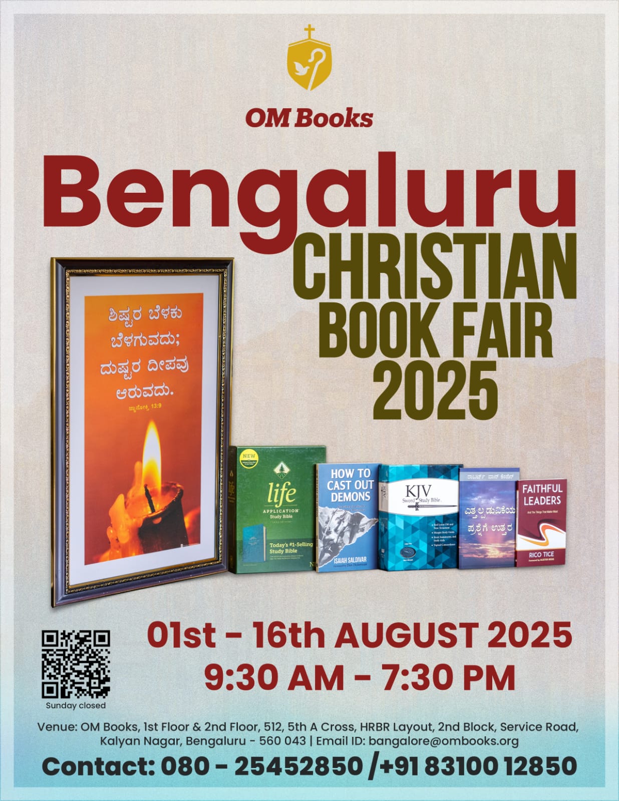 ബെംഗളുരു: ക്രിസ്തീയ സാഹിത്യ പുസ്തകങ്ങളുടെ ലോകത്തിലെ ഏറ്റവും വലിയ പ്രസാധകരും വിതരണക്കാരുമായ ഒ എം.ബുക്സ് ആഗസ്റ്റ് 1 മുതൽ 16വരെ ഔട്ടർ റിംങ് റോഡിന് സമീപം കല്യാൺ നഗർ ഒ എം പുസ്തകശാല കെട്ടിടത്തിൽ ബെംഗളൂരു ക്രിസ്തീയ പുസ്തകമേള നടക്കും. വിവിധ ഭാഷകളിലുള്ള ബൈബിളുകൾ , ധ്യാന ഗ്രന്ഥങ്ങൾ , ബൈബിൾ നിഘണ്ടു , ബൈബിൾ കമന്ററികൾ, പഠന ഗ്രന്ഥങ്ങൾ, വേദശാസ്ത്രം തുടങ്ങി പതിനായിരത്തിൽപരം വ്യത്യസ്ത ശീർഷകങ്ങളിലുള്ള ഗ്രന്ഥങ്ങൾ മേളയിൽ ഒരുക്കിയിട്ടുണ്ട്. ദിവസവും രാവിലെ 9.30 മുതൽ വൈകിട്ട് 7.30 വരെ നടക്കുന്ന മേള 16ന് സമാപിക്കും.