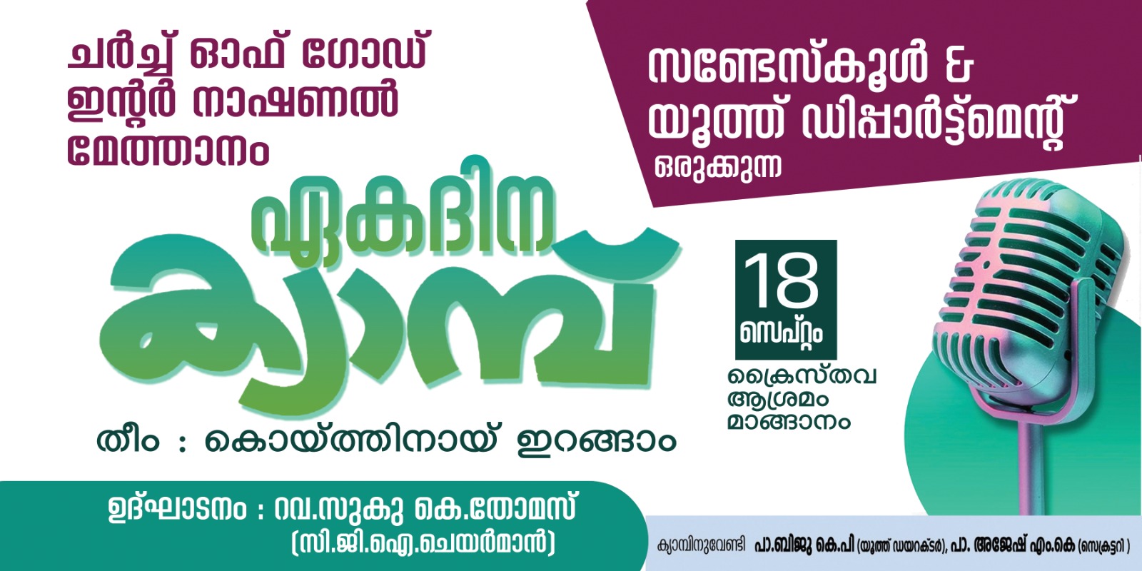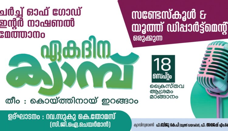 മാങ്ങാനം : ചർച്ച് ഓഫ് ഗോഡ് ഇന്റർനാഷണൽ മേത്താനം സൺഡേ സ്കൂൾ ആൻഡ് യൂത്ത് ഡിപ്പാർട്ട്മെന്റിന്റെ ആഭിമുഖ്യത്തിൽ സെപ്റ്റംബർ 18 ന് മാങ്ങാനം ക്രൈസ്തവ ആശ്രമത്തിൽ ഏക ദിന ക്യാമ്പ് നടക്കും.