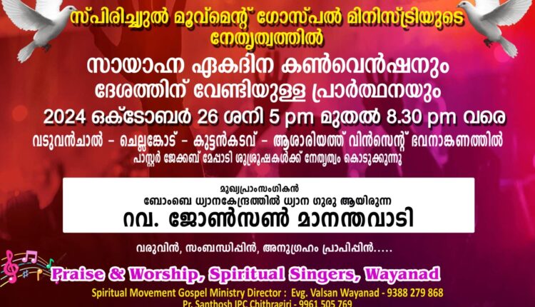വടുവൻചാൽ : സ്പിരിച്വൽ മൂവ്മെൻ്റ് ഗോസ്പൽ മിനിസ്ട്രിയുടെ ആഭിമുഖ്യത്തിൽ ഒക്ടോബർ 26 ശനിയാഴ്ച വടുവൻചാൽ ചെല്ലങ്കോട് കുട്ടൻകടവ് ആശാരിയത്ത് വിൻസെൻ്റ് ഭവനാങ്കണത്തിൽ സായാഹ്ന ഏകദിന കൺവെൻഷനും ദേശത്തിന് വേണ്ടിയുള്ള പ്രാർത്ഥനയും നടക്കും.
