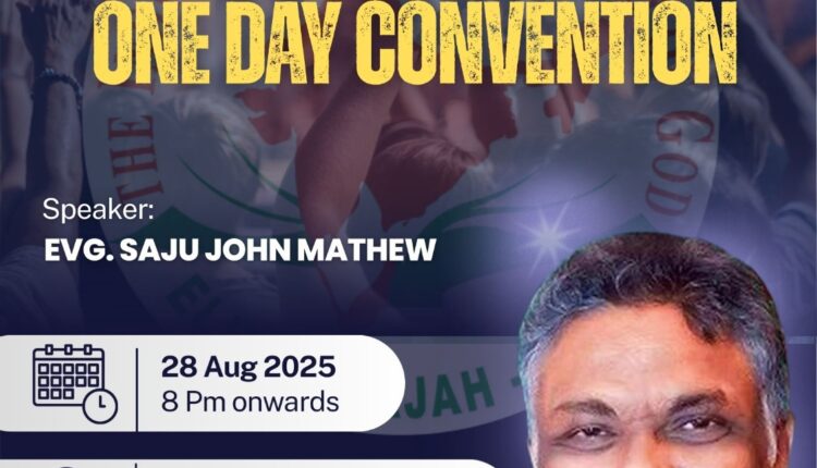 ഷാർജ: ഐ പി സി എലീം, ഷാർജ, റാസൽഖൈമ സഭകളുടെ ആഭിമുഖ്യത്തിൽ ഷാർജ സാസ് ഇവന്റ് മാനേജ്മെന്റ് ഹാളിൽ ഓഗസ്റ്റ് 28 നാളെ വൈകിട്ട് 8 മണി മുതൽ ഏകദിന കൺവൻഷൻ നടത്തപ്പെടുന്നു. ഇവാ. സാജു ജോൺ മാത്യു ദൈവ വചന പ്രഘോഷണം നിർവ്വഹിക്കും. പാ. ഷൈനോജ്‌ നൈനാൻ ശുശ്രൂഷകൾക്ക്‌ നേത്യത്വം നൽകും. കൂടുതൽ വിവരങ്ങൾക്ക് +971 50 200 1869