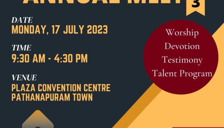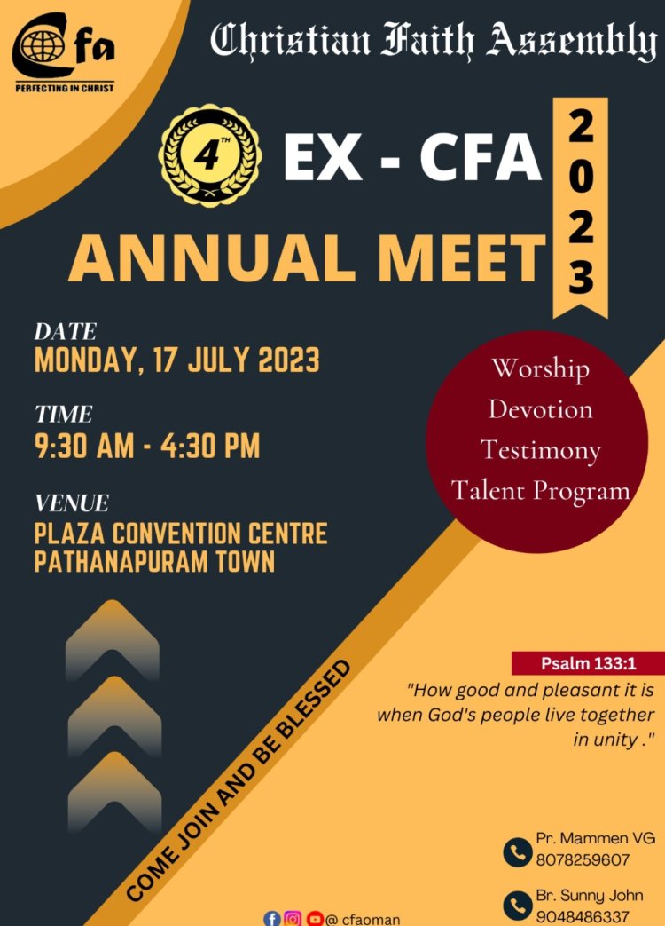 പത്തനാപുരം: മസ്കറ്റ് ക്രിസ്ത്യൻ ഫെയ്ത്ത് അസംബ്ലിയുടെ ആഭിമുഖ്യത്തിൽ എക്സ്. സി.എഫ്. എയുടെ നാലാമത് വാർഷിക കൂട്ടായ്മയും ടാലന്റ് പ്രോഗ്രാമും ജൂലൈ 17ന് രാവിലെ 9:30 മുതൽ വൈകിട്ട് 4 വരെ പത്തനാപുരം പ്ലാസ കൺവെൻഷൻ സെന്ററിൽ നടക്കും. പ്രസിഡന്റ് പാസ്റ്റർ ബിനോയ് തോമസ് ഉദ്ഘാടനം ചെയ്യും. ചർച്ച് ഓഫ് ഗോഡ് ഓൾ ഇന്ത്യ ഗവേണിംഗ് ബോഡി മെമ്പർ പാസ്റ്റർ വി.പി.തോമസ് പ്രസംഗിക്കും. ഉച്ചകഴിഞ്ഞ് ടാലന്റ് പ്രോഗ്രാം നടക്കും.
