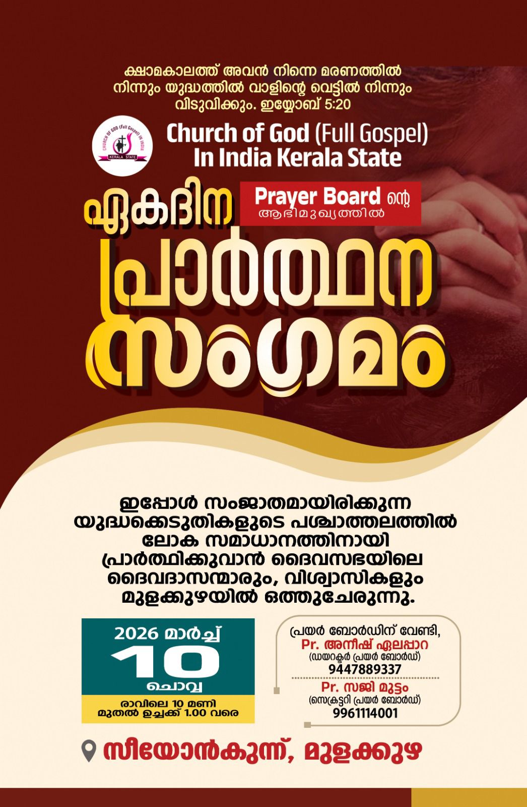 മുളകുഴ: ചർച്ച് ഓഫ് ഗോഡ് ഇൻ ഇന്ത്യ കേരളാ സ്റ്റേറ്റ് പ്രയർ ബോർഡിന്റെ നേതൃത്വത്തിൽ ഏക ദിന പ്രാർത്ഥനാ സംഗമം 2026 മാർച്ച് 10 ചൊവ്വ രാവിലെ10 മുതൽ ഉച്ചക്ക് 1 മണി വരെ മുളക്കുഴ സീയോൻ കുന്നിൽ നടക്കും. ദൈവസഭ സ്റ്റേറ്റ് ഓവർസിയർ പാസ്റ്റർ വൈ റെജി ഉദ്ഘാടനം ചെയ്യുന്ന യോഗത്തിൽ അസിസ്റ്റന്റ് ഓവർസിയർ ഡോ:ഷിബു കെ.മാത്യു ലഘു സന്ദേശവും എഡ്യുക്കേഷൻ ഡയറക്ടർ ഡോ.ജയിസൻ പ്രാർത്ഥന സെക്ഷൻ നയിക്കുന്നതുമായിരിക്കും.