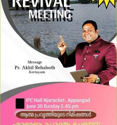 വൈപ്പിൻ : യുണൈറ്റഡ് പെന്തക്കോസ്ത് ഫെലോഷിപ്പിന്റെ ആഭിമുഖ്യത്തിൽ ഞായറാഴ്ച   വൈകിട്ട് ചർച്ച് ഹാളിൽ ഏകദിന റിവൈവൽ മീറ്റിങ്ങും എസ്.എസ്.എൽ.സി, പ്ലസ് ടു പരീക്ഷകളിൽ ഉന്നത വിജയം നേടിയ വിദ്യാർത്ഥികൾക്ക് ക്യാഷ് അവാർഡ് വിതരണവും നടക്കും.