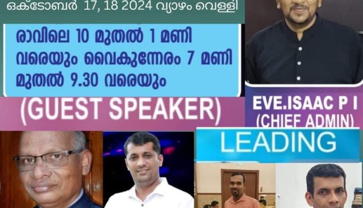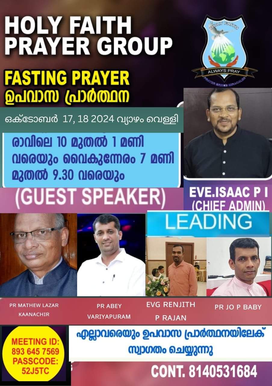 ഹോളി ഫെയ്ത് പ്രയർ ഗ്രൂപ്പിന്റെ ആഭിമുഖ്യത്തിൽ ഒക്ടോബർ 17 നും 18 നും സൂം പ്ലാറ്റ് ഫോമിൽ ഉപവാസ പ്രാർത്ഥന നടക്കും. പാ. മാത്യു ലാസർ, പാ. എബി എന്നിവർ എന്നിവർ പ്രസംഗിക്കും. പാ. ജോ പി ബേബി, ഇവാ. രഞ്ജിത് പി രാജൻ എന്നിവർ നേതൃത്വം നൽകും.