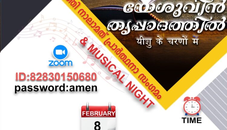 മസ്കറ്റ്: യേശുവിൻ തൃപ്പാദത്തിൽ നാൽപ്പത്തി നാലാമത് പ്രാർത്ഥനാ സംഗമവും ഗാനസന്ധ്യയും ഫെബ്രുവരി 8 ശനിയാഴ്ച രാത്രി 7.30ന് ഓൺലൈനിൽ നടക്കും.