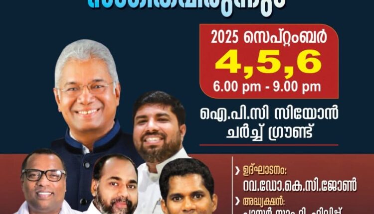 റവ. കെ സി ജോൺ ഉദ്ഘാടനം നിർവഹിക്കും. പാ. സാം ടി ഫിലിപ്പ് അധ്യക്ഷത വഹിക്കും. പാ. ഷമീർ കൊല്ലം, പാ. അനീഷ് കാവാലം, പാ. കെ ജെ തോമസ് കുമളി എന്നിവർ പ്രസംഗിക്കും.