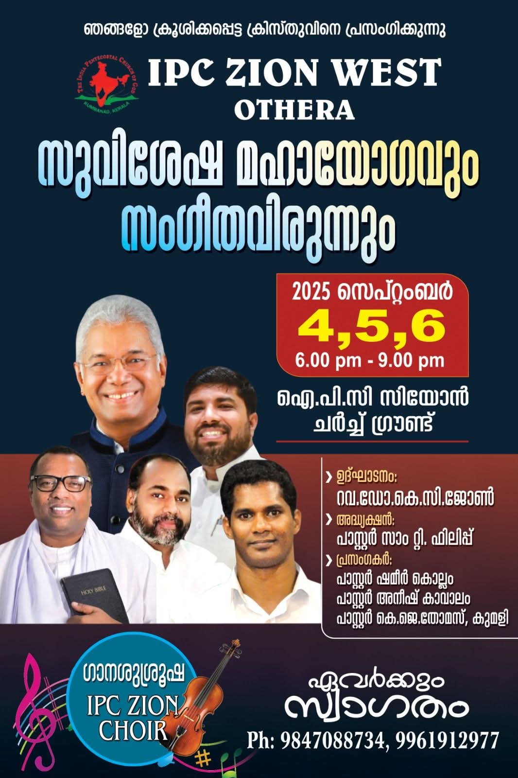 ഓതറ : ഓതറ ഐപിസി സീയോൻ വെസ്റ്റിന്റെ ആഭിമുഖ്യത്തിൽ സെപ്റ്റംബർ 4 മുതൽ 6 വരെ ഐപിസി സീയോൻ ചർച്ച് ഗ്രൗണ്ടിൽ സുവിശേഷയോഗവും സംഗീത വിരുന്നും നടക്കും.