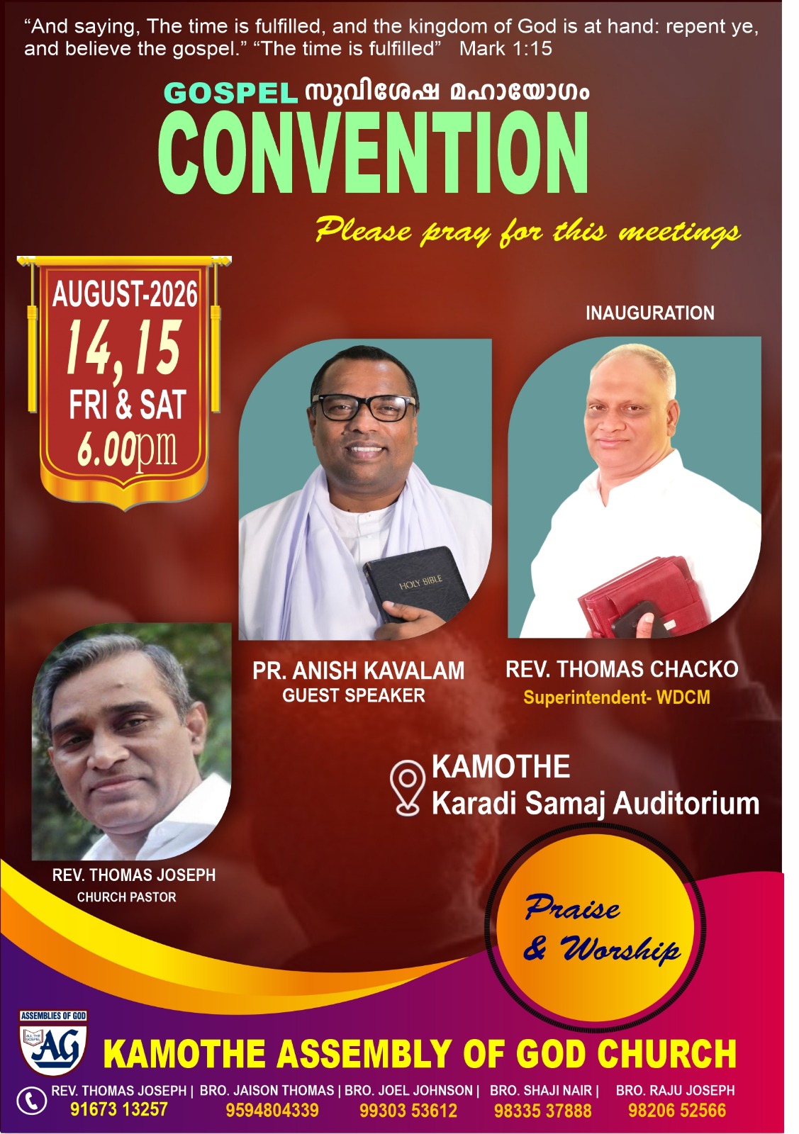 കാമോഠേ- നവി മുംബൈ : അസംബ്ലി ഓഫ് ഗോഡ് – കാമോഠേ ചർച്ചിന്റെ ആഭിമുഖ്യത്തിൽ രണ്ട്‌ ദിവസത്തെ കൺവൻഷൻ കാരാഡി സമാജ് ഓഡിറ്റോറിയത്തിൽ വച്ച് 2026 ഓഗസ്റ്റ് 14, 15 (വെള്ളി, ശനി) ദിവസങ്ങളിൽ നടക്കും. കർത്താവിൽ പ്രസിദ്ധ സുവിശേഷ പ്രസംഗകൻ പാസ്റ്റർ അനീഷ് കാവാലം (കേരളം) ദൈവവചനം ശുശ്രൂഷിക്കും.