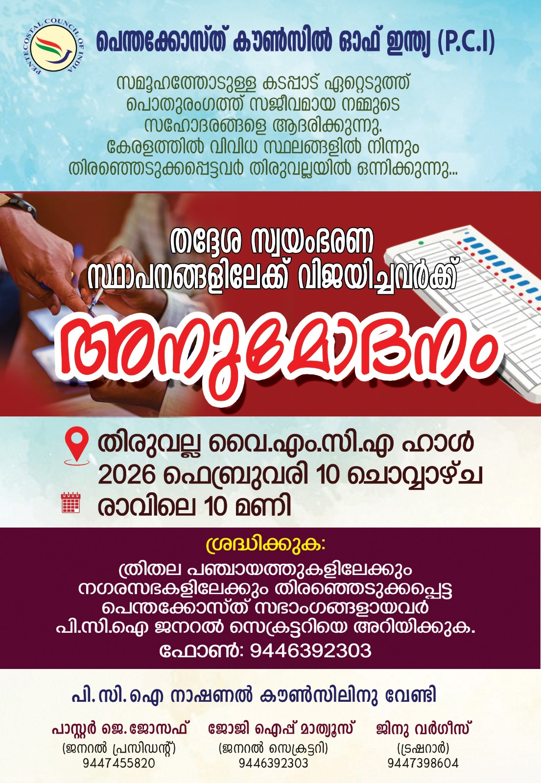 ത്രിതല പഞ്ചായത്തുകളിലേക്കും നഗരസഭകളിലേക്കും തിരഞ്ഞെടുക്കപ്പെട്ട പെന്തക്കോസ്ത് സഭാംഗങ്ങൾ ഫെബ്രുവരി 3 ന് മുൻപ് പി.സി.ഐ ജനറൽ സെക്രട്ടറി ജോജി ഐപ്പ് മാത്യൂസിനെ അറിയിക്കണം. ഫോൺ: 94463 92303.