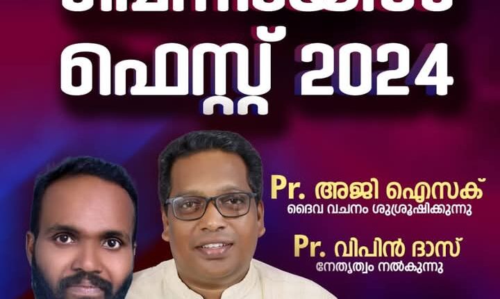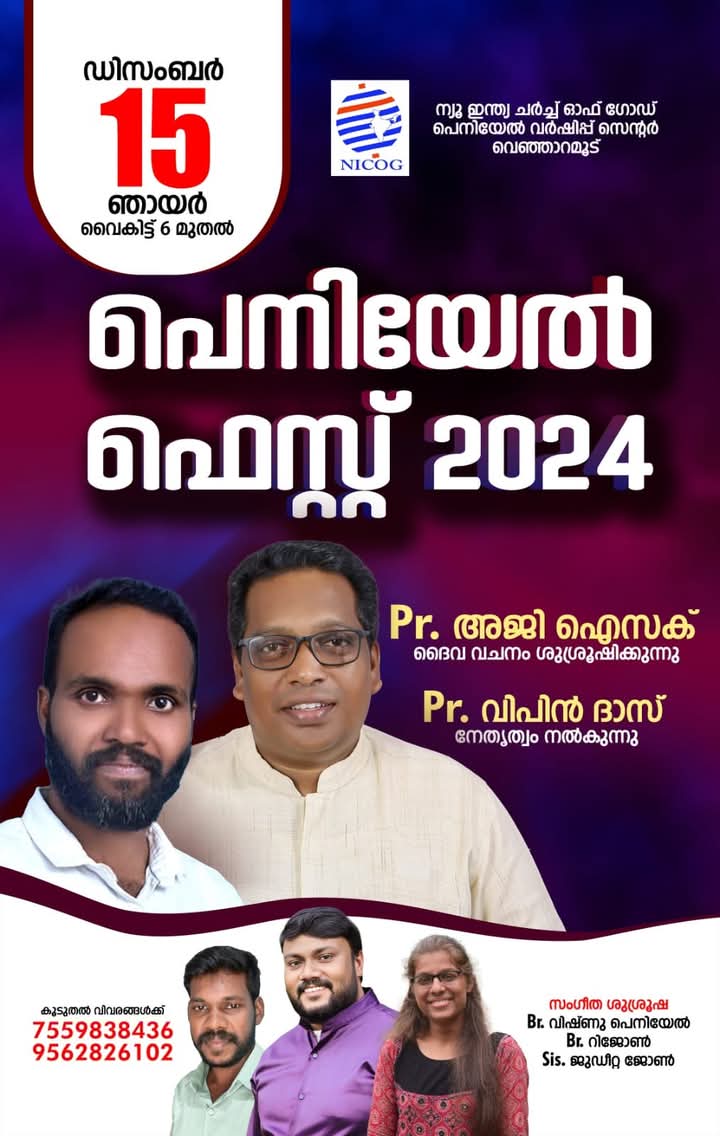 വെഞ്ഞാറമൂട് : വെഞ്ഞാറമൂട് ന്യൂ ഇന്ത്യ ചർച്ച് ഓഫ് ഗോഡ് പെനിയേൽ വർഷിപ്പ് സെൻ്ററിന്റെ ആഭിമുഖ്യത്തിൽ ഡിസംബർ 15 ഞായറാഴ്ച പെനിയേൽ ഫെസ്റ്റ് 2024 നടക്കും.