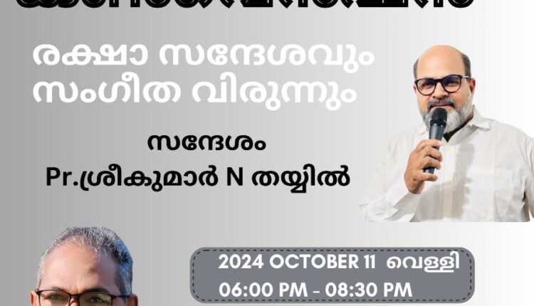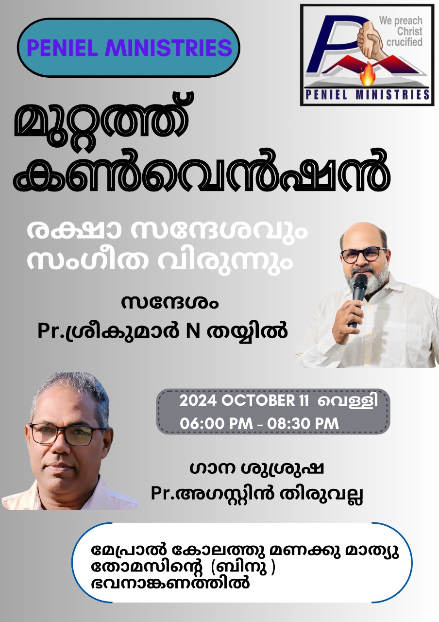 മേപ്രാൽ : പെനിയേൽ മിനിസ്ട്രീസിന്റെ ആഭിമുഖ്യത്തിൽ ഒക്ടോബർ 11 മേപ്രാൽ കോലത്തു മണക്കു മാത്യു തോമസിന്റെ ഭവനാങ്കണത്തിൽ മുറ്റത്ത് കൺവെൻഷൻ രക്ഷാ സന്ദേശവും സംഗീത വിരുന്നും നടക്കും. പാ. ശ്രീകുമാർ എം. തയ്യിൽ പ്രസംഗിക്കും. പാ. അഗസ്റ്റിൻ തിരുവല്ല ഗാന ശുശ്രുഷ നയിക്കും.