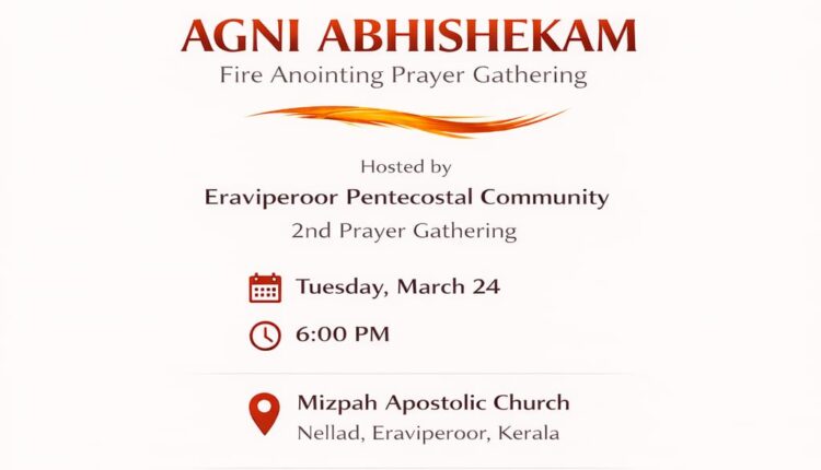 ഇരവിപേരൂർ: ഇരവിപേരൂർ പെന്തക്കോസ്ത് കമ്മ്യൂണിറ്റിയുടെ രണ്ടാമത് ഐക്യ സമ്മേളനം – അഗ്നി അഭിഷേകം – നാളെ വൈകിട്ട് ആറിന് നെല്ലാട് മിസ്പ അപ്പൊസ്തലിക് ചർച്ചിൽ നടക്കും. കാൽവറി റ്റാബർനാക്കിൾ ചർച്ച് ജനറൽ സെക്രട്ടറി മുഖ്യ പ്രഭാഷണം നടത്തും. കിംഗ്ഡം റിവൈവൽ ചർച്ച് പ്രസിഡണ്ട് പാസ്റ്റർ ജോൺസൺ ഡാനിയേൽ അധ്യക്ഷത വഹിക്കും.