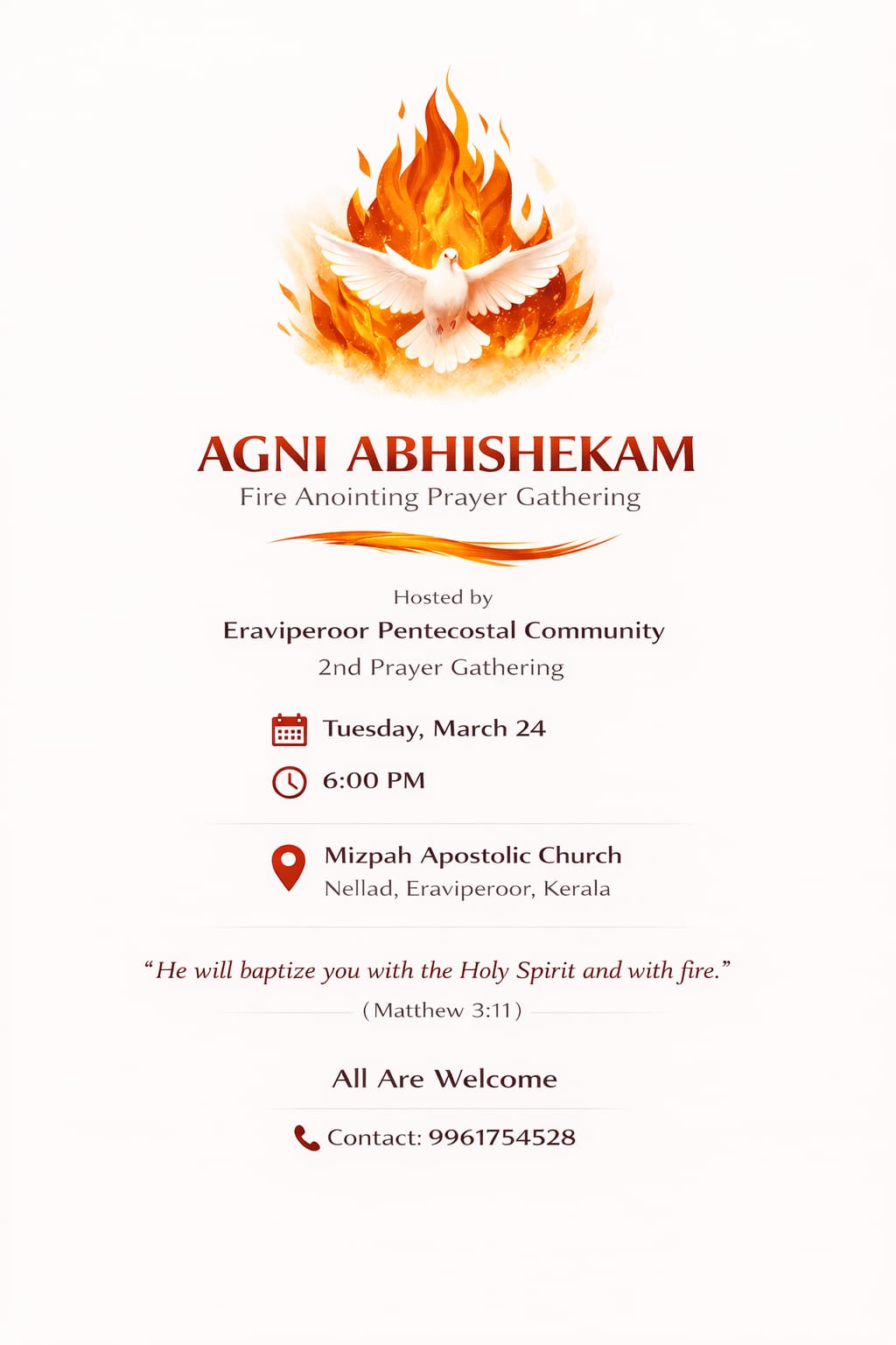 പശ്ചിമേഷ്യയിലെ സമാധാനത്തിന് വേണ്ടിയുള്ള പ്രാർത്ഥനക്ക് പാസ്റ്റർ രാജേഷ് നേതൃത്വം നൽകും. ബ്രദർ ഷിബു ജോൺ സ്വാഗതവും പാസ്റ്റർ ലിജു ജേക്കബ് നന്ദിയും പ്രകാശിപ്പിക്കും. പാസ്റ്റർമാരായ ഫിലിപ്പ്, ജ്യോതിസ് എന്നിവർ വർഷിപ്പിന് നേതൃത്വം കൊടുക്കും. ഇരവിപേരൂരും പരിസരത്തും ഉള്ള ദൈവദാസന്മാരും വിശ്വാസികളും പങ്കെടുക്കും.