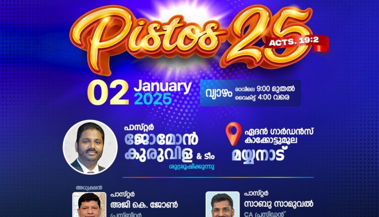 കൊല്ലം : അസംബ്ളിസ് ഓഫ് ഗോഡ് യുവജന വിഭാഗമായ ക്രൈസ്റ്റ് അംബാസഡേഴ്സ് കൊല്ലം സെക്ഷന്റെ ആഭിമുഖ്യത്തിൽ ജനുവരി 2 രാവിലെ പത്തു മുതൽ വൈകിട്ട് നാലു വരെ മയ്യനാട് കാക്കോട്ടുമൂല ഏദൻ ഗാർഡനിൽ പിസ്തോസ് 25 ( അ. പ്ര. 19.2) നടക്കും. കൊല്ലം സെക്ഷൻ പ്രസ് ബിറ്റർ റവ. അജി കെ ജോൺ അദ്ധ്യക്ഷത വഹിക്കും. മലയാളം ഡിസ്ട്രിക്ക് പ്രയർ ഡിപ്പാർട്ടുമെൻ്റ് ഡയറക്ടറർ പാ. ജോമോൻ കുരുവിള പ്രസംഗിക്കും.