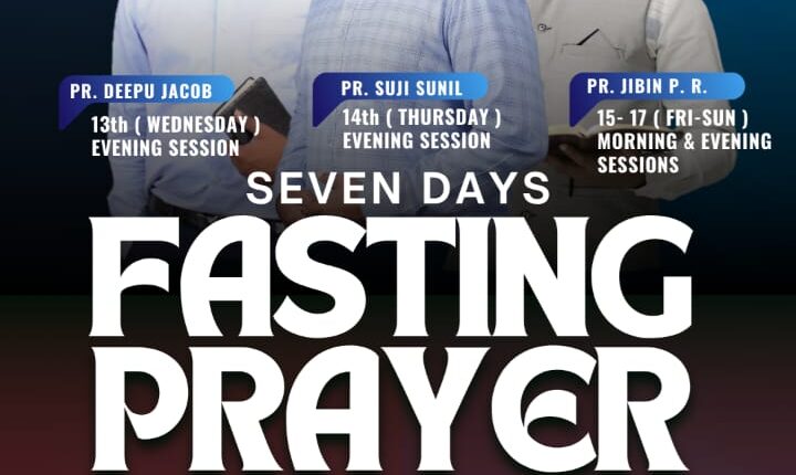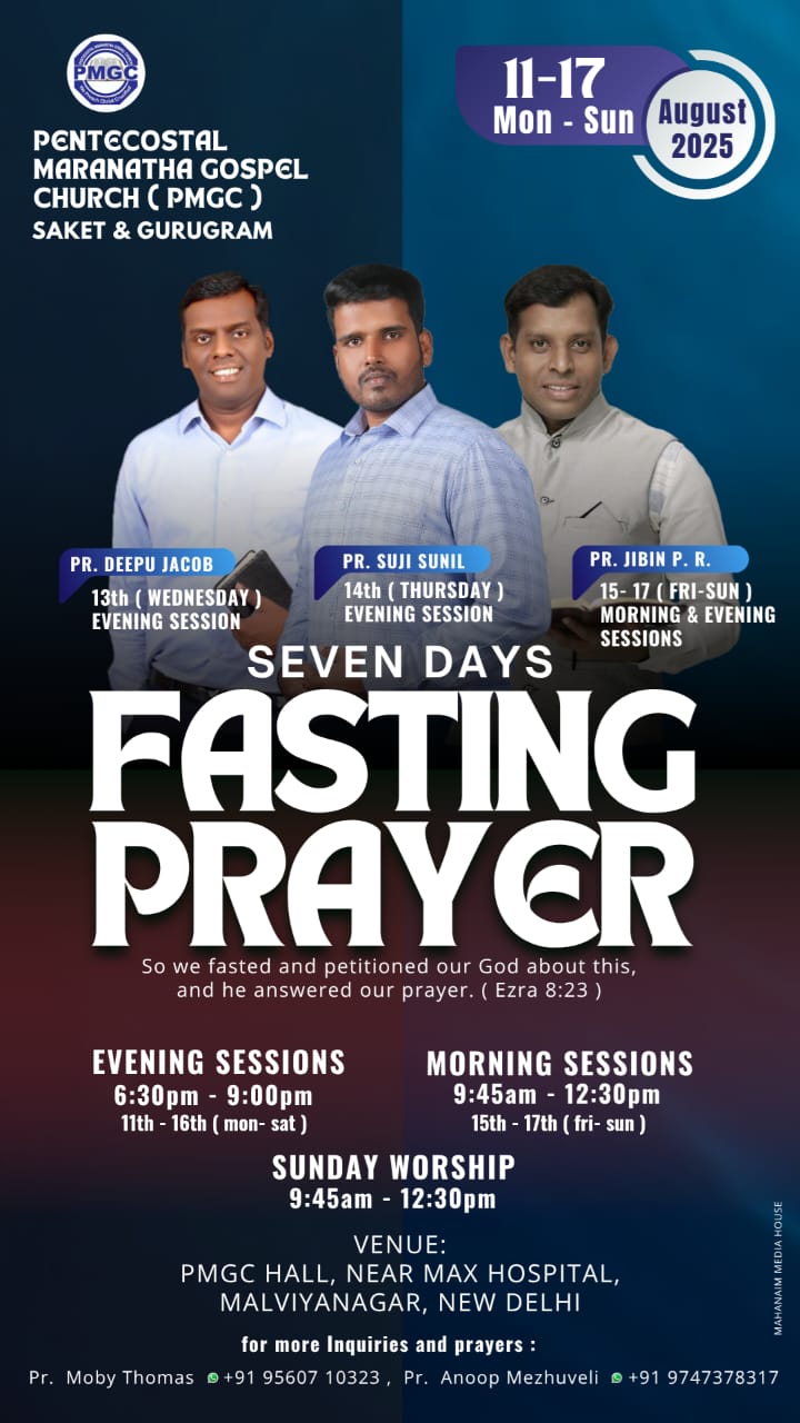 ന്യൂഡെൽഹി : പി എം ജി സാക്കേത് ചർച്ചിന്റെ ആഭിമുഖ്യത്തിൽ ആഗസ്റ്റ് 11 മുതൽ 17 വരെ ന്യൂഡൽഹി സാക്കേത് മാക്സ് ആശുപത്രിക്ക് സമീപം പി എം ജി സാക്കേത് ചർച്ചിൽ പ്രത്യേക ഉപവാസ പ്രാർത്ഥനാ സംഗമം നടക്കും. യോഗത്തിൽ പാസ്റ്റർമാരായ സുജി സുനിൽ, ദീപു ജേക്കബ്, ജിബിൻ പി ആർ എന്നിവർ പ്രസംഗിക്കും.