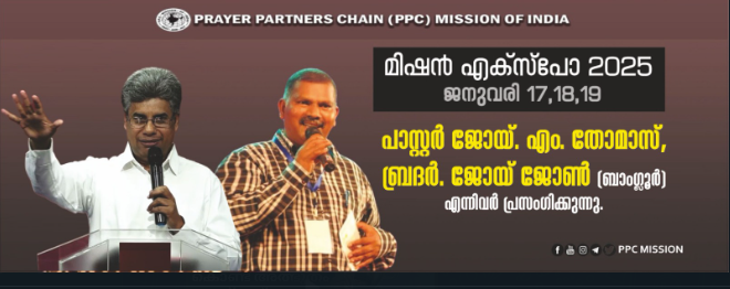 പി.പി.സി മിഷൻ ഓഫ് ഇന്ത്യ മിഷൻ എക്സ്പോ ChristianNews On Aug 20, 2024 54 കുന്നംകുളം : പി.പി.സി മിഷൻ ഓഫ് ഇന്ത്യയുടെ ആഭിമുഖ്യത്തിൽ 2025 ജനുവരി 17 മുതൽ 19 വരെ മിഷൻ എക്സ്പോ നടക്കും. പാ. ജോയ് എം. തോമസ്, ബ്രദർ ജോയ് ജോൺ എന്നിവർ പ്രസംഗിക്കും. 54 Share