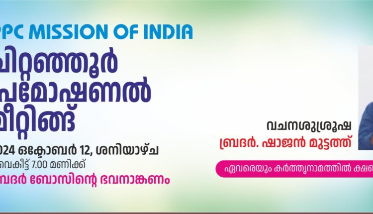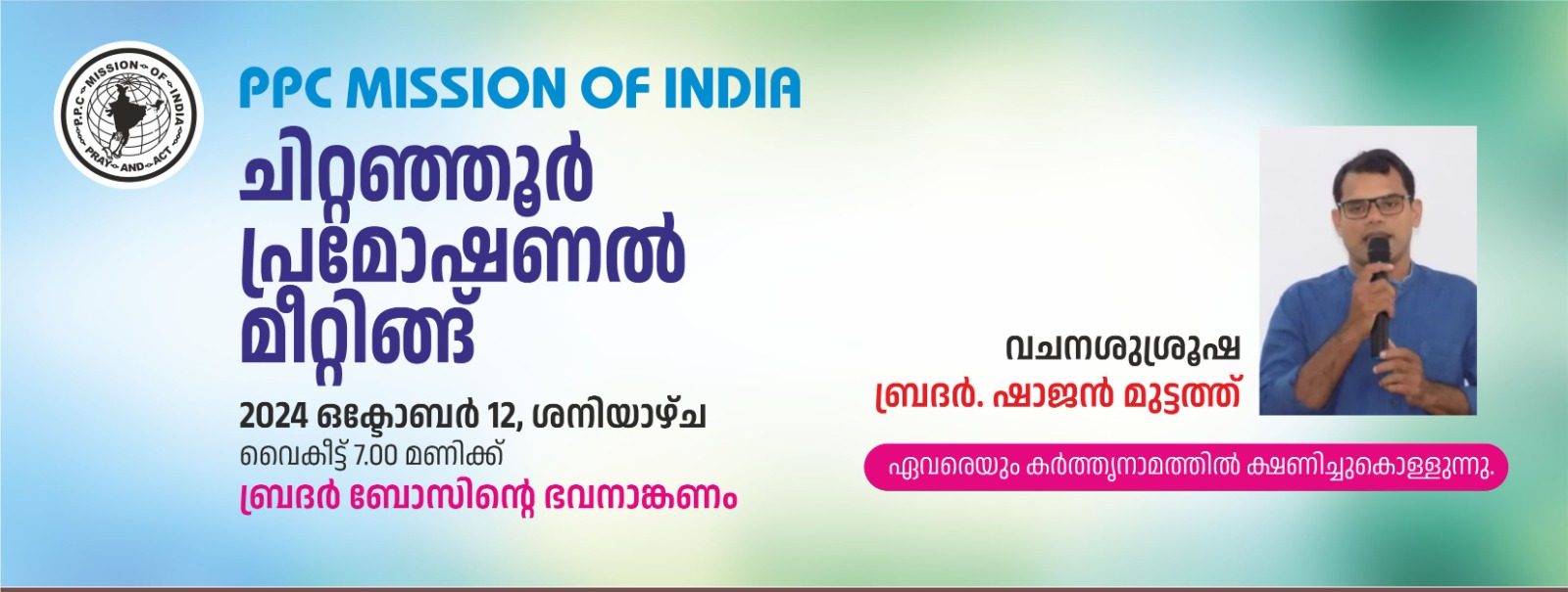 ചിറ്റഞ്ഞൂരിൽ പി.പി.സി മിഷൻ ഓഫ് ഇന്ത്യ പ്രമോഷണൽ മീറ്റിംഗ് ChristianNews On Aug 22, 2024 52 ചിറ്റഞ്ഞൂർ : പി.പി.സി മിഷൻ ഓഫ് ഇന്ത്യയുടെ ആഭിമുഖ്യത്തിൽ ചിറ്റഞ്ഞൂർ ബ്രദർ ബോസിന്റെ ഭവനാങ്കണത്തിൽ ഒക്ടോബർ 12 ന് ചിറ്റഞ്ഞൂർ പ്രമോഷണൽ മീറ്റിംഗ് നടക്കും. ബ്രദർ ഷാജൻ മുട്ടത്ത് പ്രസംഗിക്കും. 52 Share