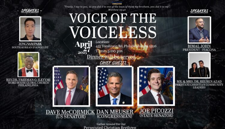 ഫിലദൽഫിയ : ക്രൈസ്തവ പീഡനം രൂക്ഷമായ രാജ്യങ്ങളിലെ വിശ്വാസ സമൂഹങ്ങൾക്കായി ഫിലദൽഫിയായിൽ പ്രാർത്ഥന സംഗമം സംഘടിപ്പിക്കുന്നു. എക്ലിഷ്യ യുണൈറ്റഡ് ഇന്റർനാഷനൽ എന്ന രാജ്യാന്തര ക്രൈസ്തവ സംഘടനയുടെ നേതൃത്വത്തിൽ ഏപ്രിൽ 27 ഞായറാഴ്ച വൈകിട്ട് അഞ്ചു മണിക്ക് ഫിലദൽഫിയ ഇന്ത്യൻ ക്രിസ്ത്യൻ അസംബ്ലി ( 455 Tomlinson Rd, Philadelphia, PA 19116) നടക്കുന്ന പരിപാടിയിൽ യുഎസ് സെനറ്റർ ഡേവ് മക്കോർമിക്, യുഎസ് കോൺഗ്രസ് അംഗം ഡാൻ മ്യുസെർ എന്നിവർ മുഖ്യാതിഥികളായിരിക്കും.