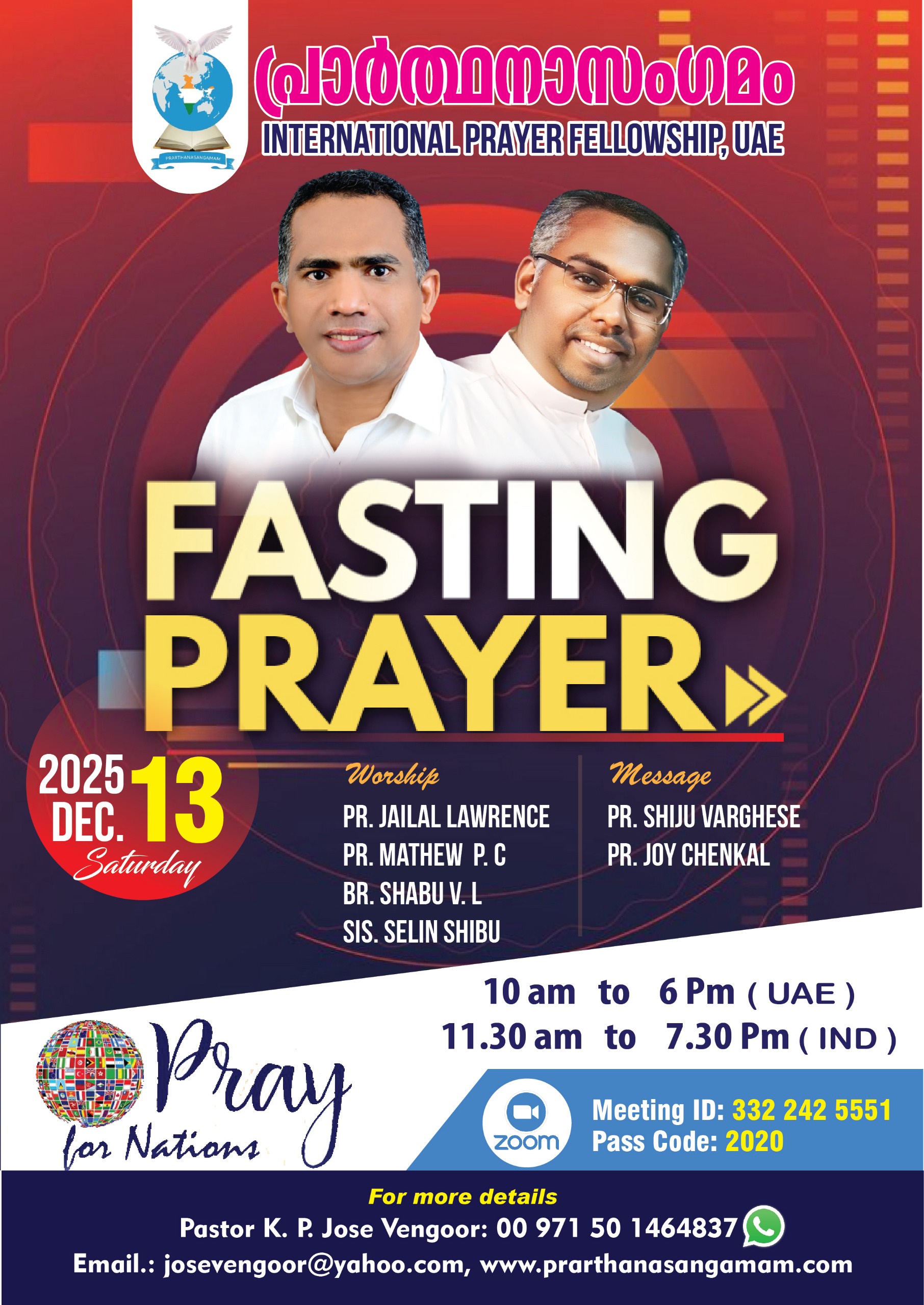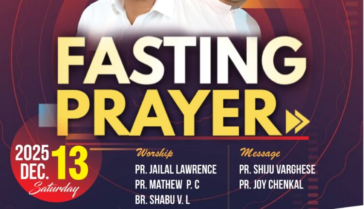 ഷാർജ : പ്രാർത്ഥനാസംഗമം (International Prayer Fellowship ) ഒരുക്കുന്ന ഉപവാസ പ്രാർത്ഥന നാളെ( ഡിസംബർ 13 ശനിയാഴ്ച )രാവിലെ 10 മണി മുതൽ രാത്രി 6 മണി വരെ (യു. എ. ഇ സമയം ) നടക്കും. പാസ്റ്റർ ഷിജു വർഗീസ്, പാസ്റ്റർ ജോയ് ചീനക്കൽ എന്നിവർ ദൈവ വചനം ശ്രുശൂഷിക്കുകയും പാസ്റ്റർ ജെയ്ലാൽ ലോറൻസ് , പാസ്റ്റർ മാത്യു പി. സി, ബ്രദർ ഷാബു വി. എൽ, സിസ്റ്റർ സെലിൻ ഷിബു എന്നിവർ ആരാധനക്ക് നേതൃത്വം നൽകും. രാജ്യങ്ങൾക്ക് വേണ്ടിയും ( Pray for Nations ) മറ്റുള്ളവരെ വിഷയങ്ങൾക്ക് വേണ്ടിയും ഉള്ള പ്രാർത്ഥനകൾക്ക് പാസ്റ്റർ കെ. പി. ജോസ് വേങ്ങൂർ നേതൃത്വം നൽകും. Zoom മീറ്റിംഗ് ID 332 242 5551 Paascode: 2020