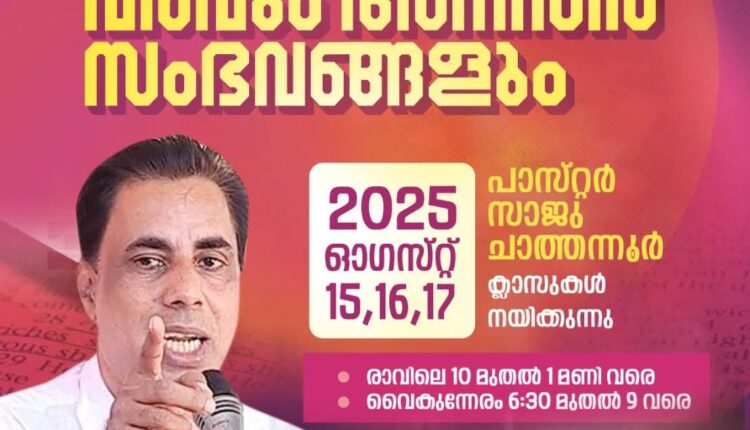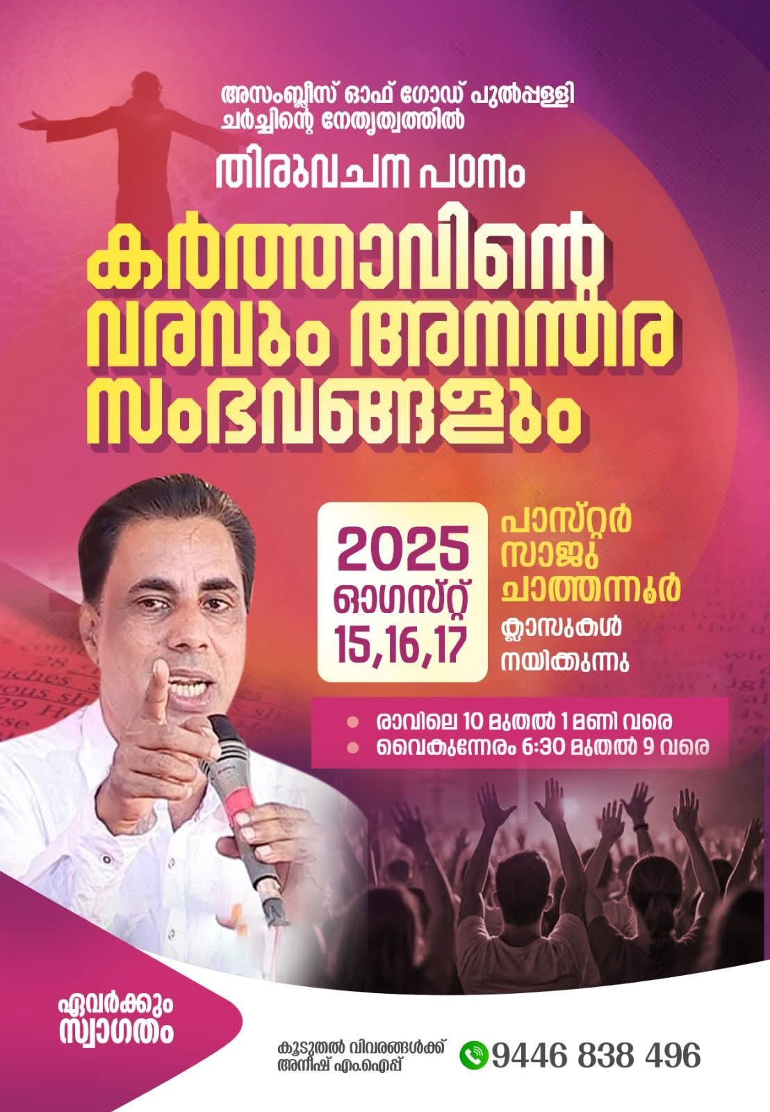 പുൽപ്പള്ളി അസംബ്ലീസ് ഓഫ് ഗോഡ് ചർച്ചിൽ ബൈബിൾ പഠന ക്ലാസ് ChristianNews On Aug 13, 2025 646 പുൽപ്പള്ളി : അസംബ്ലീസ് ഓഫ് ഗോഡ് പുൽപ്പള്ളി ചർച്ചിന്റെ ആഭിമുഖ്യത്തിൽ ആഗസ്റ്റ് 15 മുതൽ 17 വരെ ബൈബിൾ പഠനം നടക്കും. പാ. സജു ചാത്തന്നൂർ പ്രസംഗിക്കും 646 Share