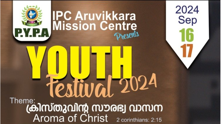 തിരുവനന്തപുരം : പി.വൈ.പി.എ ഐപിസി അരുവിക്കര മിഷൻ സെന്ററിന്റെ ആഭിമുഖ്യത്തിൽ സെപ്റ്റംബർ 16 നും 17 നും വെള്ളെക്കടവ്, വട്ടിയൂർക്കാവ് ഐപിസി ഹെബ്രോൺ ഹാളിൽ യൂത്ത് ഫെസ്റ്റിവൽ 2024 നടക്കും.