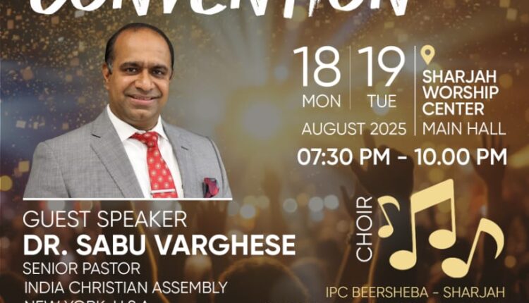 ഷാർജ : പി.വൈ. പി എ യൂ.എ.ഇ റീജിയണിന്റ 2025 വാർഷിക കൺവെൻഷൻ ഓഗസ്റ്റ് 18,19 (തിങ്കൾ, ചൊവ്വ) ദിവസങ്ങളിൽ വൈകിട്ട് 7. 30 മുതൽ 10. 00 വരെ ഷാർജ വർഷിപ് സെന്റർ മെയിൻ ഹാളിൽ നടക്കും.