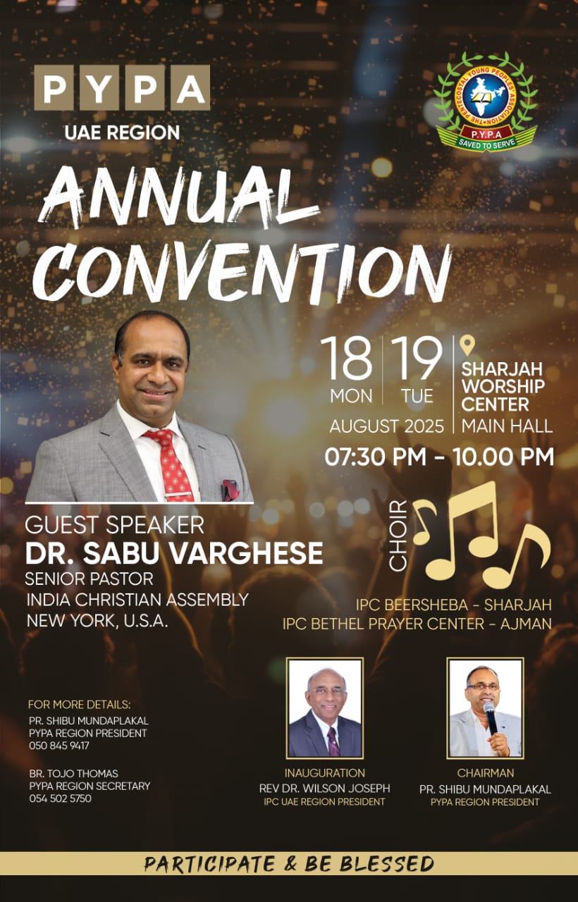 ഷാർജ : പി വൈ പി എ യുഎഇ റീജിയന്റെ ആഭിമുഖ്യത്തിൽ ഓഗസ്റ്റ് 18 നും 19 നുമായി ഷാർജ വർഷിപ് സെന്റർ മെയിൻ ഹാളിൽ വാർഷിക കൺവെൻഷൻ നടക്കും. റെവ. സാബു വർഗീസ് യുഎസ്എ മുഖ്യ സന്ദേശം നൽകും.