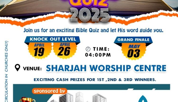 ഷാർജ : പി വൈ പി എ യു.എ.ഇ. റീജിയന്റെ നേതൃത്വത്തിൽ ക്രമീകരിച്ചിരിക്കുന്ന മെഗാ ബൈബിൾ ക്വിസ് “ബറകാ” ഏപ്രിൽ 19, 26 തീയതികളിലും മെയ് 3-നുമായി ഷാർജ വാർഷിപ് സെന്ററിൽ നടത്തപ്പെടുന്നു.