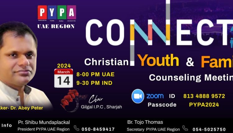 പി വൈ പി എ യു എ ഇ റീജിയൺ ക്രെമീകരിച്ചിരിക്കുന്ന യൂത്ത് & ഫാമിലി കൗൺസിലിംഗ് മീറ്റിംഗ് മാർച്ച് 14th ന് ZOOM PLATFORMൽ 8.00 pm മുതൽ 10.00 pm വരെ നടത്തപ്പെടുന്നു.ഈ മീറ്റിംഗിൽ വേദാദ്ധ്യാപകനും കൗൺസിലർയുമായ Dr.എബി പീറ്റർ ശ്രിശൂഷിക്കുന്നു. യോഗത്തിൻറെ അനുഗ്രഹത്തിനായി പി വൈ പി എ യു എ ഇ റീജിയൺൻറെ നേതൃത്വത്തിൽ ക്രെമീകരണങ്ങൾ ചെയ്തുവരുന്നു.കൂടുതൽ വിവരങ്ങൾക്ക്. പി .വൈ.പി എയു എ ഇ റീജിയൻ പ്രസിഡന്റ് പാസ്റ്റർ ഷിബു മുണ്ടപ്ലാക്കൽ (050-8459417) പി .വൈ.പി എയു എ ഇ റീജിയൻ സെക്രട്ടറി ബ്രദർ റ്റോജോ തോമസ് (054-5025750) എന്നിവരുമായി ബന്ധപെടുക