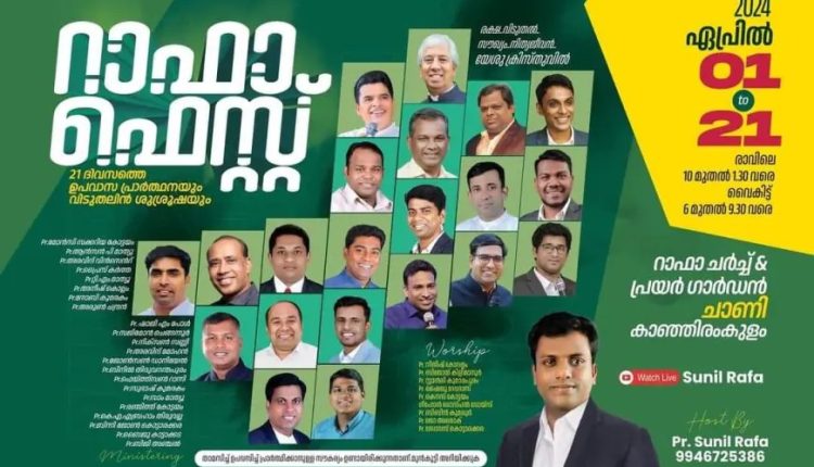കാഞ്ഞിരംകുളം : 21 ദിവസത്തെ ഉപവാസ പ്രാർത്ഥനയും വിടുതലിൻ ശുശ്രൂഷയും 2024 ഏപ്രിൽ 1 മുതൽ 21 വരെ രാവിലെ 10 മുതൽ 1.30 വരെയും വൈകിട്ട് 6 മുതൽ 9.30 വരെ കാഞ്ഞിരംകുളം ചാണിയിലുള്ള റാഫാ ചർച്ച് & പ്രയർ ഗാർഡനിൽ വെച്ചു നടത്തപ്പെടും. അനുഗ്രഹീതരായ ദൈവദാസന്മാർ വിവിധ സെഷനുകളിൽ ദൈവവചനം ശുശ്രൂഷിക്കും . പാസ്റ്റർ സുനിൽ റാഫ മീറ്റിംഗുകൾക്ക് നേതൃത്വം നൽകും.
