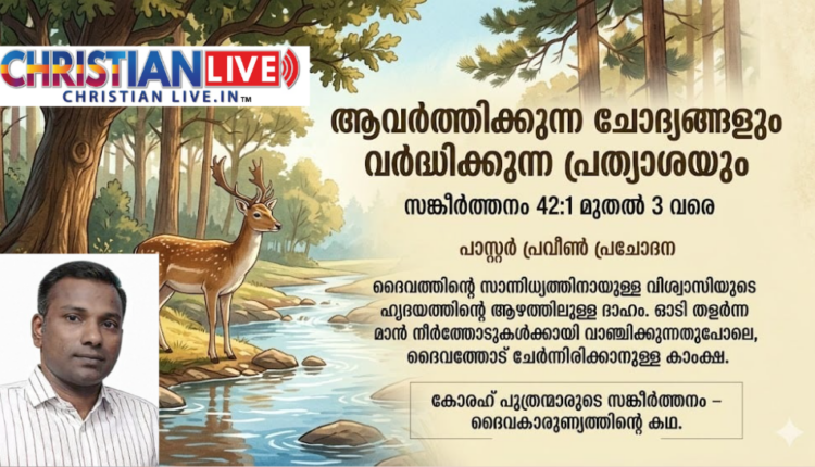 കാട്ടിലെ മൃഗങ്ങളുടെ കൂട്ടത്തിൽപ്പെടുന്ന ജീവിയാണല്ലോ മാൻ. എന്നാൽ ഉപദ്രവകാരിയല്ല.പക്ഷെ ഉപദ്രവം നേരിടുന്നതും, ജീവനുതന്നെ അപകടം എപ്പോൾ വേണമെങ്കിലും നേരിടാവുന്ന തരത്തിലാണ് ജീവിതം.വന്യമൃഗങ്ങളുടെ കടന്നാക്രമണം എപ്പോൾ വേണമെങ്കിലും സംഭവിക്കാം.എങ്കിലും ഓടാനുള്ള കഴിവ് ആശ്ചര്യമേറിയതാണ്. ഓടി തളരുമ്പോൾ, ദാഹം കൊണ്ട് വരളുമ്പോൾ നീർത്തോടിനരികെ എത്തപ്പെടുന്നത് ആശ്വാസമാണ്. അതുപോലെ മനുഷ്യനും ദൈവസന്നിധിയിൽ എത്തുവാൻ കാംക്ഷിക്കുകയാണ്. ഇതു ദൈവത്തെ പ്രാപിക്കുന്നതിനുവേണ്ടിയുള്ള മനുഷ്യന്റെ ദാഹത്തെ കാണിക്കുന്നു. ദൈവം ജീവനുള്ള ദൈവം ആയതിനാൽ അവിടുന്ന് ജീവന്റെ ജലം ആണ്. നാം ഏതിലെങ്കിലും, എന്തിലെങ്കിലും തൃപ്തി അടയുന്നവരായല്ല. എപ്പോഴും ദൈവത്തിൽ സംതൃപ്തി പ്രാപിക്കുന്നവരാകണം. ദൈവം ജീവനുള്ളവൻ നാം അവനാൽ ജീവിക്കുന്നവരാണ്. അതുകൊണ്ട് ഏതൊരവസ്ഥയിലും നാം ജീവൻ നിലനിറുത്തേണ്ടതിനു അത് നിത്യമായി ദൈവത്തിൽ ചെന്നുചേരേത്തേണ്ടതിനു ദൈവീകദാഹം ഉള്ളവരായിരിക്കണം.