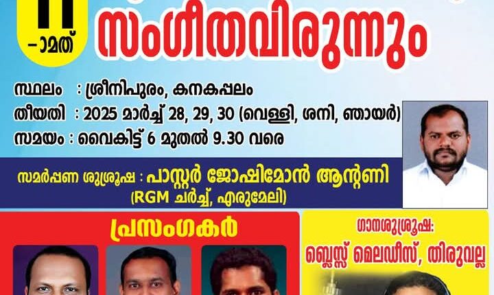 കനകപ്പലം : കനകപ്പാലം റഡീമിങ് ഗോസ്പൽ മിനിസ്ട്രിയുടെ ആഭിമുഖ്യത്തിൽ മാർച്ച് 28 മുതൽ 30 വരെ ശ്രീനിപുരം കനകപ്പാലത്ത് 11 -മത് സുവിശേഷ മഹായോഗവും സംഗീതവിരുന്നും നടക്കും.