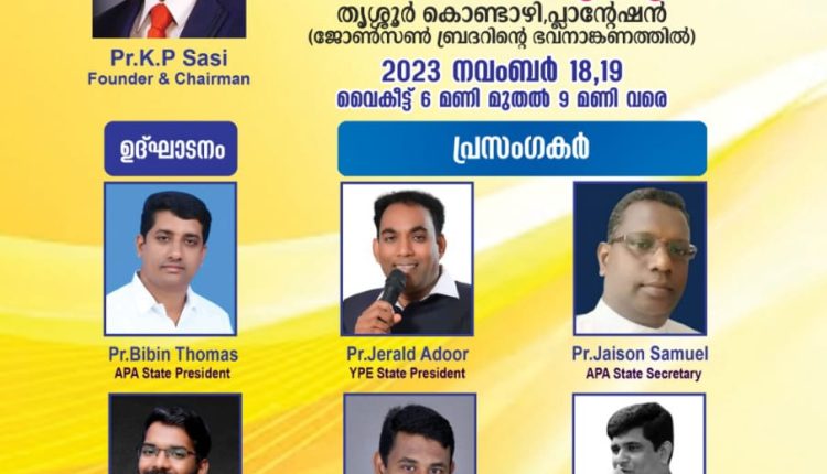 കൊണ്ടാഴി പ്ലാന്റേഷൻ ജോൺസൺ ബ്രദറിന്റെ ഭവനാങ്കണത്തിൽ അഖിലേന്ത്യ പെന്തക്കോസ്ത് ഐക്യവേദി എ. പി. എ യുടെ നേതൃത്വത്തിൽ റിവൈവൽ ഫെസ്റ്റ് 2023 നവംബർ 18,19 തീയതികളിൽ ശനി ഞായർ ദിവസങ്ങളിൽ വൈകിട്ട് 6 മുതൽ 9 വരെ നടക്കും. ഉദ്ഘാടനം. Pr.ബിബിൻ തോമസ് എ.പി.എ സ്റ്റേറ്റ് പ്രസിഡന്റ്. Pr. ജയ്സൺ സാമുവൽ (വൈ പി ഇ സ്റ്റേറ്റ് സെക്രട്ടറി), Pr. ജെറാൾഡ് അടൂർ (വൈ.പി. ഇ സ്റ്റേറ്റ് പ്രസിഡന്റ്) ഇനീ ദൈവദാസന്മാർ മുഖ്യ പ്രഭാസാഹനം നടത്തും. എഫഥാ വോയ്സ് തൃശ്ശൂർ ഗാന ശുശ്രൂഷക്കു നേതൃത്വം നൽകും. PR. ടൈറ്റസ് കുന്നംകുളം ,PR. റെജി സ്റ്റീഫൻ എന്നെ ദൈവദാസന്മാർ മീറ്റിംഗുകൾക്കു നേതൃത്വം നൽകും.