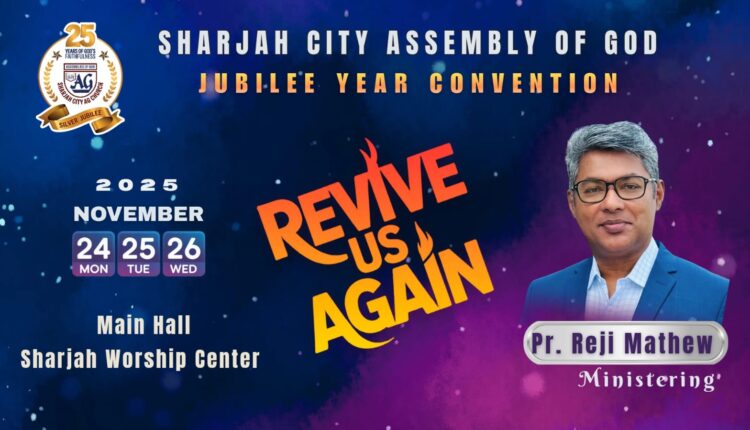 ഷാർജ: ഷാർജ സിറ്റി എ.ജി. ചർച്ചിന്റെ ആഭിമുഖ്യത്തിൽ “Revive Us Again” എന്ന മൂന്ന് ദിവസത്തെ ആത്മീയ കൺവെൻഷൻ നവംബർ 24, 25, 26 തീയതികളിൽ ഷാർജ വർഷിപ്പ് സെന്റർ മെയിൻ ഹാളിൽ വച്ച് നടത്തപ്പെടുന്നു.