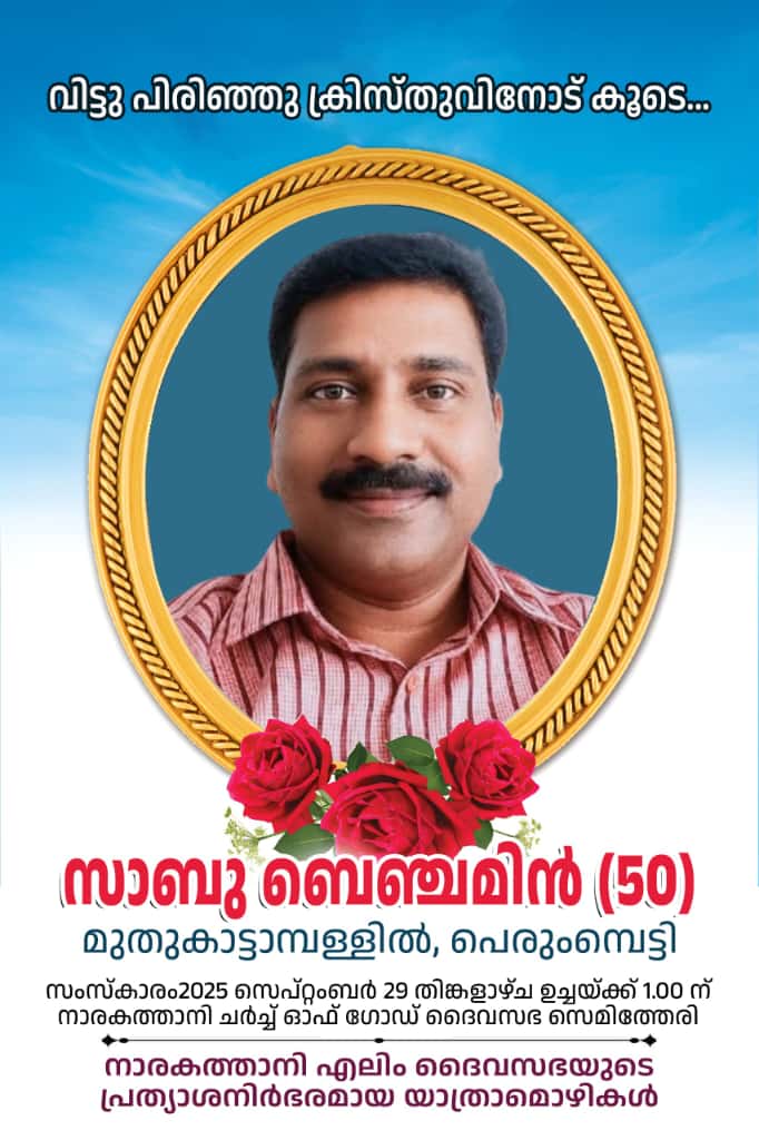 നാരകത്താനി: ദൈവസഭ കേരള റീജിയന് എജുക്കേഷന് സെല് ഡയറക്ടര് ബ്രദര് സജി തോമസിന്റെ സഹോദരനും നാരകത്താനി സഭ അംഗവും പെരുംമ്പെട്ടി മുതുകാട്ടാമ്പള്ളില് വീട്ടില് സാബു ബെഞ്ചമിന് (50) നിത്യതയില് പ്രവേശിച്ചു. സംസ്കാരം 2025 സെപ്റ്റംബര് 29 തിങ്കളാഴ്ച ഉച്ചയ്ക്ക് 1.00 ന് നാരകത്താനി എലിം ദൈവസഭ സെമിത്തേരിയില്. ദൈവസഭ അഡ്മിനിസ്ട്രീവ് ബിഷപ്പ് റവ. ജോമോന് ജോസഫ് മുഖ്യ കാര്മികത്വത്തില് ദൈവസഭ കൗണ്സില് അംഗവും മല്ലപ്പള്ളി സെന്റര് മിനിസ്റ്റര് പാസ്റ്റര് എം.പി മാത്യു ശുശ്രൂഷകള്ക്ക് നേതൃത്വം നല്കും. ദൈവസഭ മുന് സീനിയര് ശുശ്രൂഷകനും ഇപ്പോള് നിത്യതയില് വിശ്രമിക്കുന്ന കര്ത്തൃദാസന് പാസ്റ്റര് എം.റ്റി. ബെഞ്ചമിന്റെ ഇളയമകനാണ്.