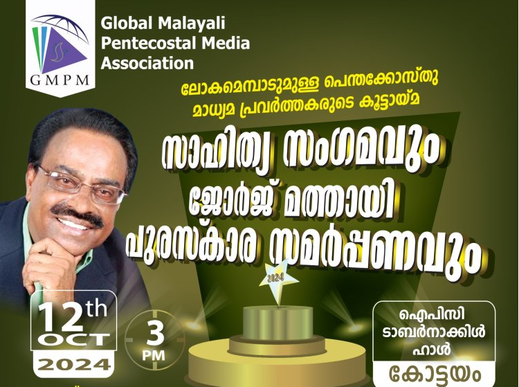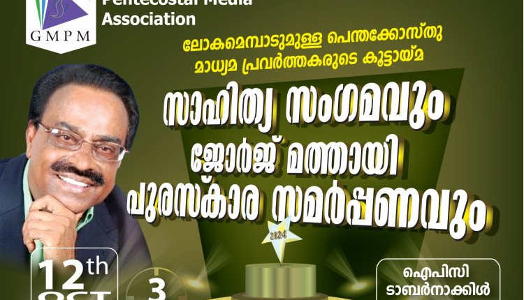 കോട്ടയം : ഗ്ലോബൽ മലയാളി പെന്തെക്കോസ്തു മീഡിയ അസോസിയേഷന്റെ ആഭിമുഖ്യത്തിൽ സാഹിത്യ സംഗമവും ജോർജ് മത്തായി പുരസ്കാര സമർപ്പണവും ഒക്ടോബർ 12 ന് വൈകിട്ട് മൂന്നിന് കോട്ടയം ടാബർനാക്കിൾ ഐപിസി ഹാളിൽ നടക്കും.