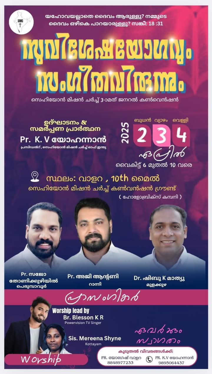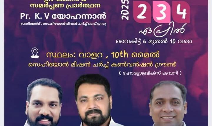 വാളറ : ഏപ്രിൽ 2 മുതൽ 4 വരെ വാളറ പത്താം മൈൽ സെഹിയോൻ മിഷൻ ചർച്ച് കൺവൻഷൻ ഗ്രൗണ്ടിൽ സെഹിയോൻ മിഷൻ ചർച്ച് 3-ാമത് ജനറൽ കൺവെൻഷൻ നടക്കും. പാ. കെ വി യോഹന്നാൻ ഉദ്ഘാടനം നിർവഹിക്കും.