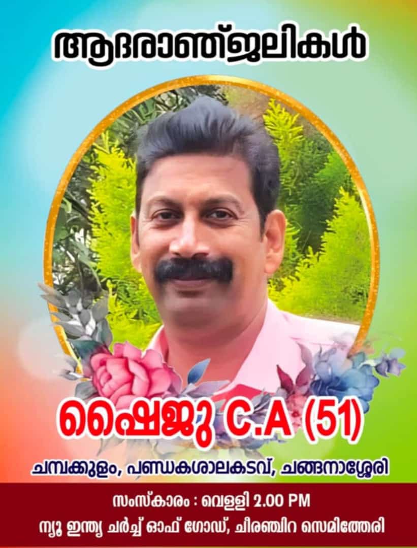 ചങ്ങനാശ്ശേരി : ചങ്ങനാശ്ശേരി ന്യൂ ഇന്ത്യാ ചർച്ച് ഓഫ് ഗോഡ് സഭാംഗം ചമ്പക്കുളത്തിൽ ഷൈജു സി. എ (52) നിത്യതയിൽ ചേർക്കപ്പെട്ടു. ഓഗസ്റ്റ് 9 വെള്ളിയാഴ്ച ഭവനത്തിലെ ശുശ്രൂഷകൾക്ക് ശേഷം ഉച്ചയ്ക്ക് 2 ന് ചീരംചിറയിലുള്ള സഭാസെമിത്തേരിയിൽ സംസ്കരിക്കും.