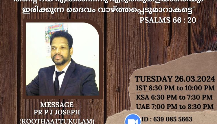 ശാലോം പ്രയർ വാരിയർസ് അവതരിപ്പിക്കുന്ന ഓൺലൈൻ സൂം പ്രയർ മീറ്റിങ്ങിലേക്കു ഏവർക്കും സ്വാഗതം . 26 .03 .24 ഇന്ത്യൻ സമയം രാത്രി 8 : 30 മുതൽ  10 വരെ നടത്തപ്പെടുന്നു. വചന സന്ദേശം പാ. ജോസഫ് കൂത്താട്ടുകുളം നിർവഹിക്കും. ബ്ര. സാം എ വി ഹെബ്രോൻ യു എ ഇ യുടെ നേതൃത്വത്തിൽ ആരാധന നടക്കും.