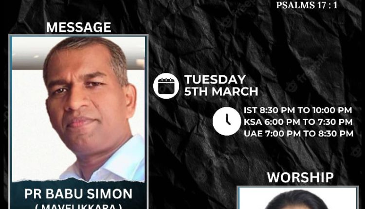 ശാലോം പ്രയർ വാരിയേഴ്സിന്റെ ഓൺലൈൻ പ്രയർ ChristianNews On Mar 5, 2024 108 ശാലോം പ്രയർ വാരിയെഴ്സിന്റെ ആഭിമുഖ്യത്തിൽ മാർച്ച് അഞ്ചിന് ഇന്ത്യൻ സമയം എട്ടു മുപ്പതുമുതൽ പത്തുമണിവരെ ഓൺലൈൻ പ്രയർ സംഘടിപ്പിക്കുന്നു. പാ.ബാബു സൈമൺ മാവേലിക്കര വചന സന്ദേശം നൽകും. സിസ്റ്റർ ഷീജ സുനിൽ ആരാധനയ്ക്കു നേതൃത്വം നൽകും. 108 Share