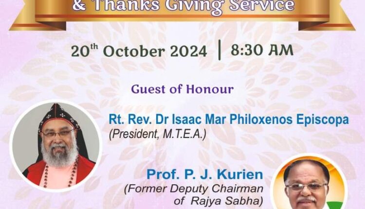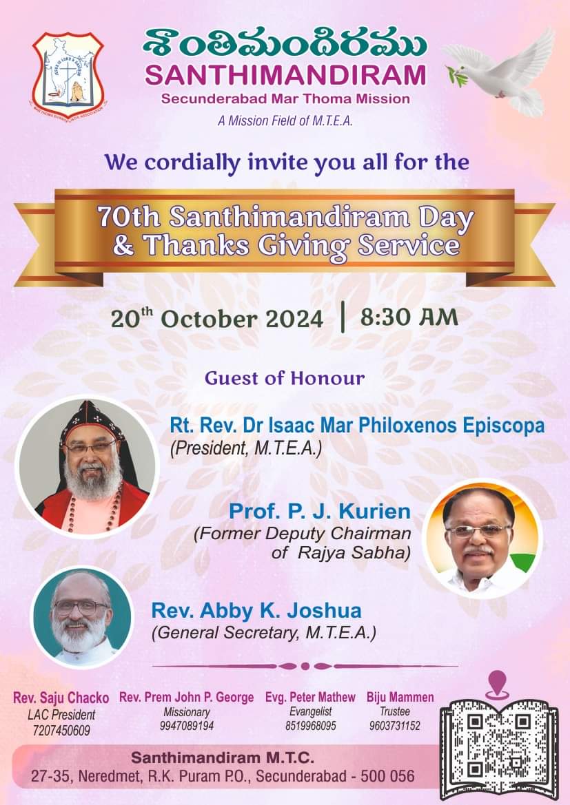 സെക്കന്തരാബാദ് : ശാന്തിമന്ദിരം സെക്കന്തരാബാദ് മാർത്തോമാ മിഷന്റെ ആഭിമുഖ്യത്തിൽ ഒക്ടോബർ 20 ന് സെക്കന്തരാബാദിൽ 70 മത് ശാന്തിമന്ദിരം ഡേ ആൻഡ് താങ്ക്സ് ഗിവിങ് സർവീസ് നടക്കും. റവ. ഐസക് മാർ ഫിലോക്സിനോസ് എപ്പിസ്കോപ്പ, പി. ജെ. കുരിയൻ, റവ. എബി കെ.ജോഷ്വ എന്നിവർ മുഖ്യ അഥിതികളായിരിക്കും.
